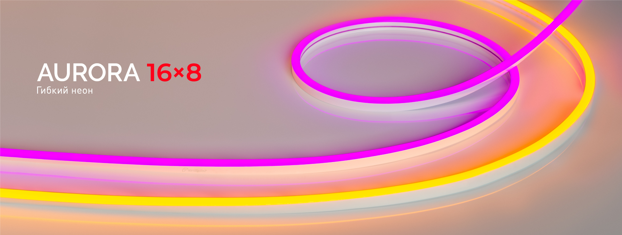Гибкий неон AURORA — отличное решение для оформления кафе, баров, ванных и детских комнат, а также создания светящихся букв, символов и рекламных вывесок. За счет прямоугольного сечения 16×8 мм гибкий неон легко встраивается в профиль и небольшие углубления в мебели. В серии представлены модели с безопасным напряжением 24 В.