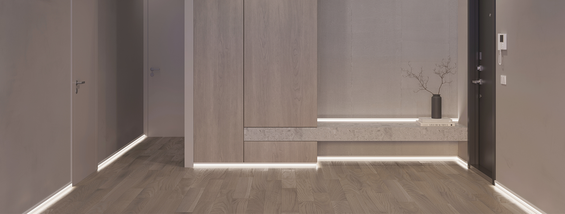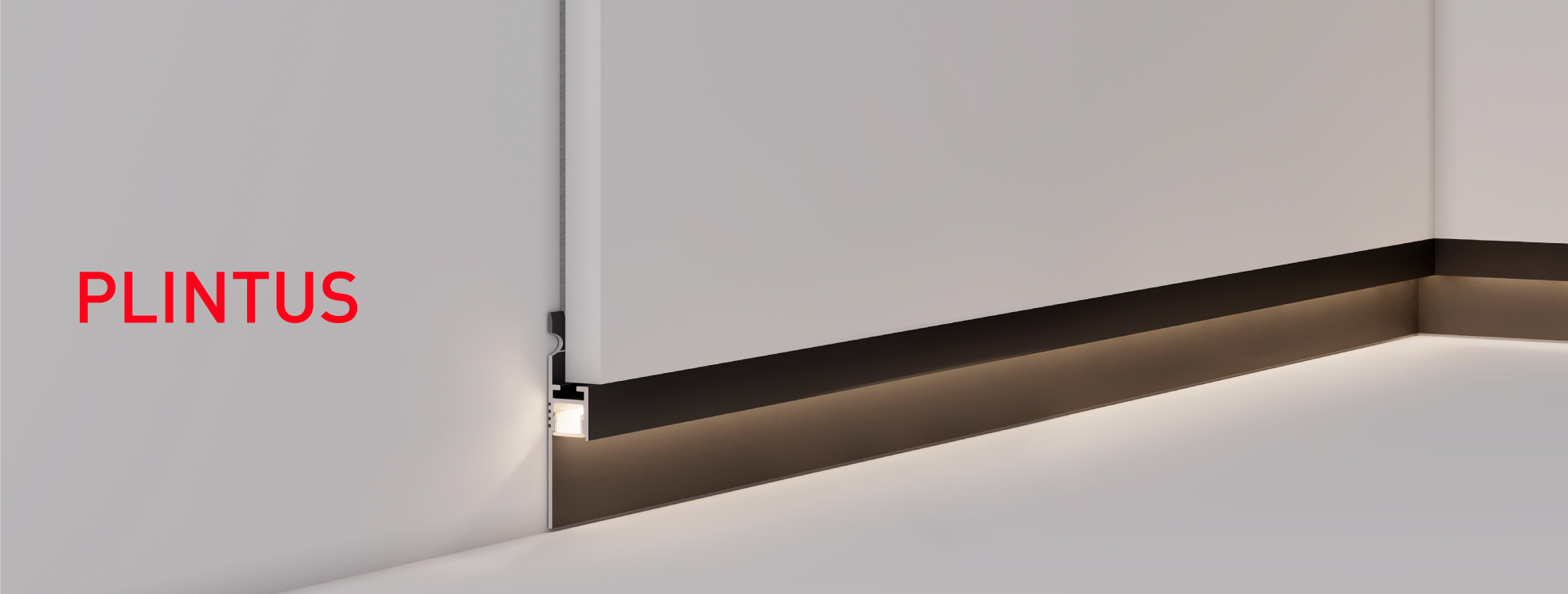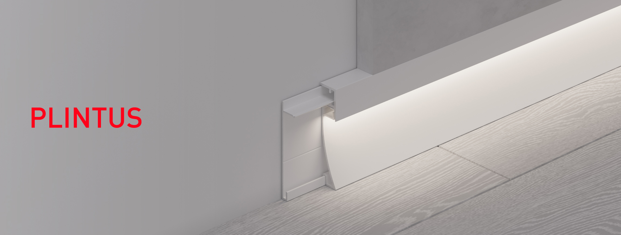 В серии PLINTUS представлен большой выбор профилей: двухкомпонентные, накладные, встраиваемые в ГКЛ (с видимым и со скрытым фланцем), а также уникальные гибкие модели. Подходят для декоративной подсветки стен и создают мягкое свечение по периметру комнаты.