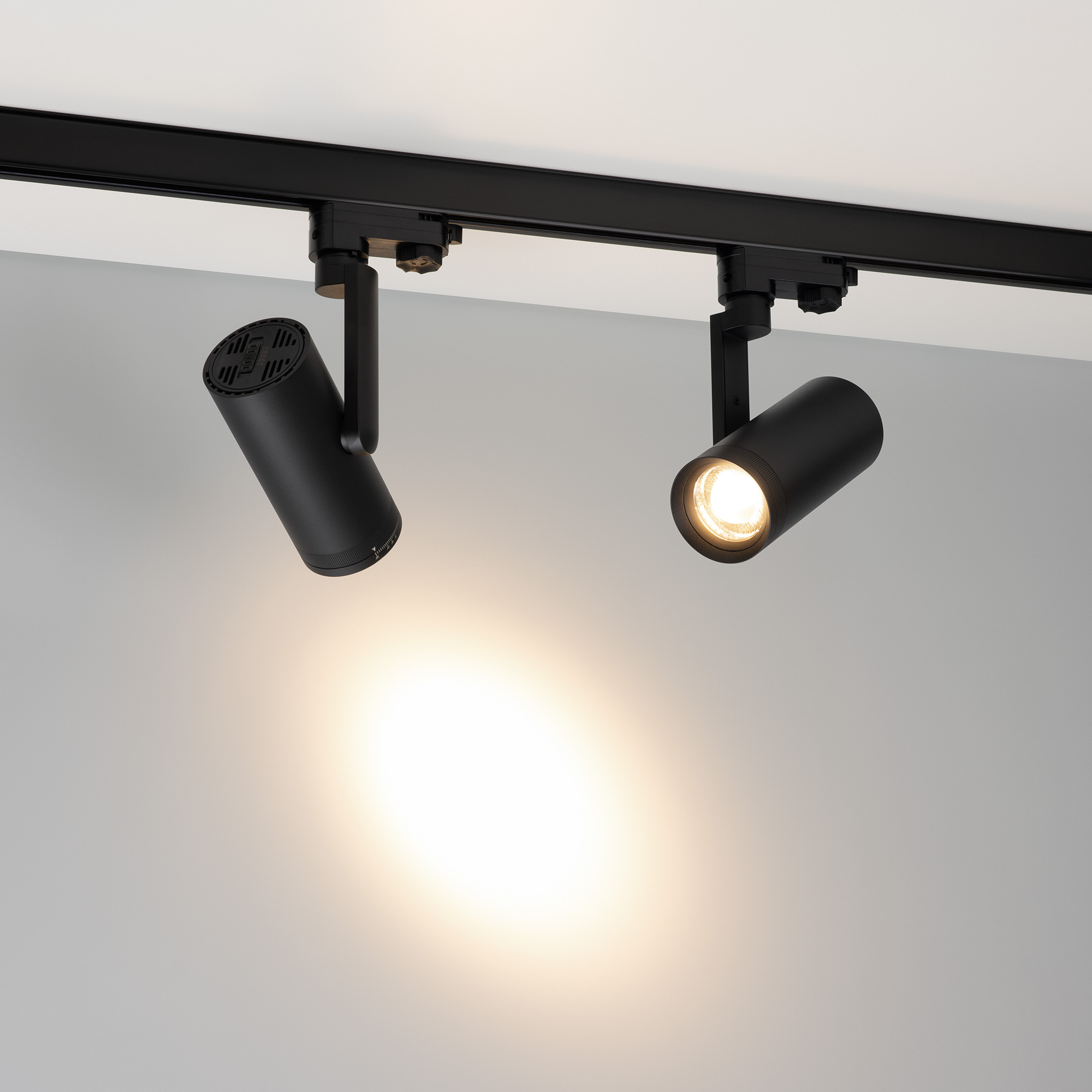 Светильник для треков/шин 4 провода, 10 Вт. Цвет свечения меняется в диапазоне 2700K/3000K/3500K/4000K/5700K (при помощи переключателя на корпусе), световой поток 560-830лм, регулируемый угол 20-50°, CRI>90. Корпус круглый, алюминий, цвет черный, IP20. Угол наклона корпуса 90°, угол поворота корпуса 330°. Габариты LxWxH: 83х65x245мм. Размер светового модуля DxL: 65x150мм. Входное напряжение AC220-240V, мощность 10Вт. Драйвер встроенный 30-40V, 230мА, 10Вт.