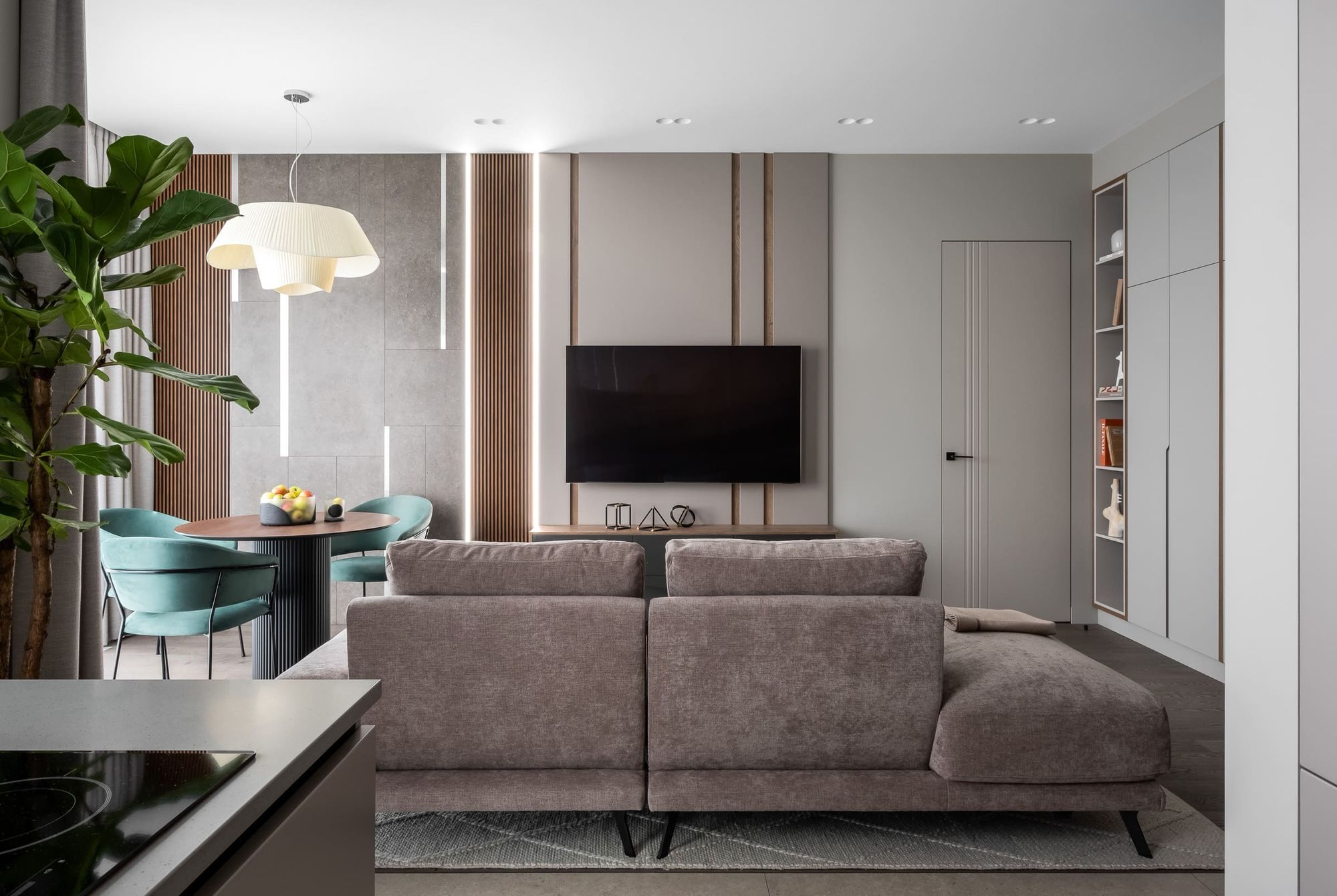 Месторасположение ЖК Spires во многом определило концепцию интерьера. За панорамными окнами квартиры на Нежинской улице в Москве раскинулся лесной пейзаж, который «проник» и внутрь пространства. Теплая цветовая гамма, состоящая из таупа, серого и белого оттенков, разбавлена элементами освежающего изумрудного цвета, а стены спальни украшены минималистичными фотообоями с изображением туманного леса.