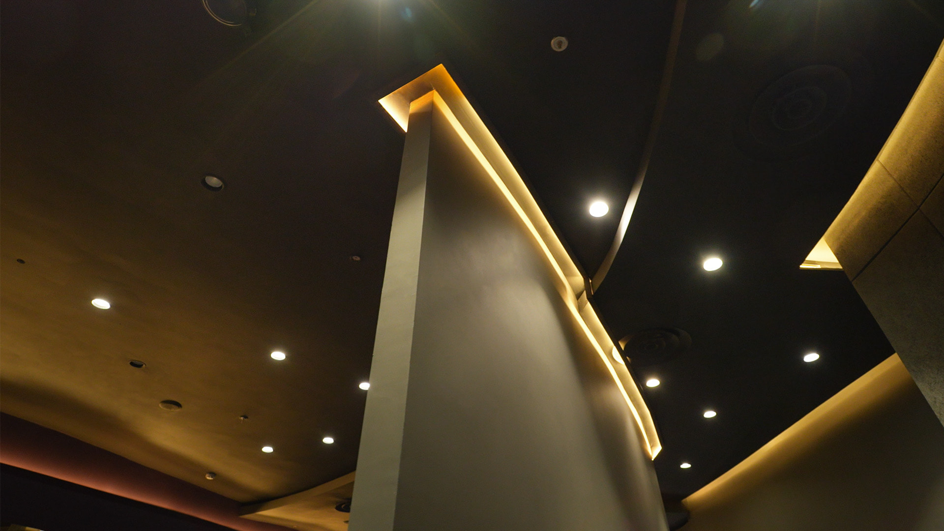 Заливающая светодиодная подсветка по периметру зала создает равномерное основное освещение.