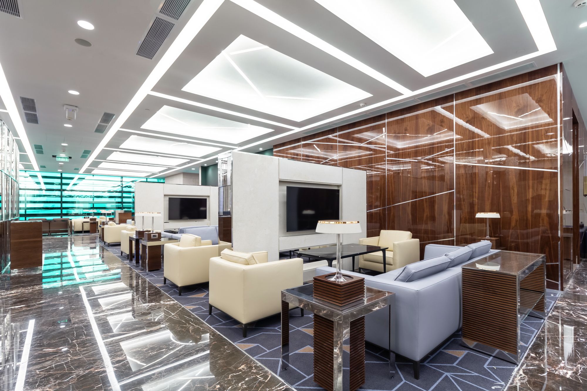 Основное освещение и декоративная подсветка реализованы с помощью светодиодных лент теплого белого свечения. Линии света гармонично интегрированы во все зоны отдыха. В комнате для переговоров с классическим строгим дизайном световые полосы на потолке добавляют мягкого рассеянного света. В комнате отдыха с отделкой темной благородной древесиной теплый свет создает уют и настраивает на спокойное общение. Аккуратная контурная подсветка создает в каждой зоне VIP-зала свое уникальное настроение.