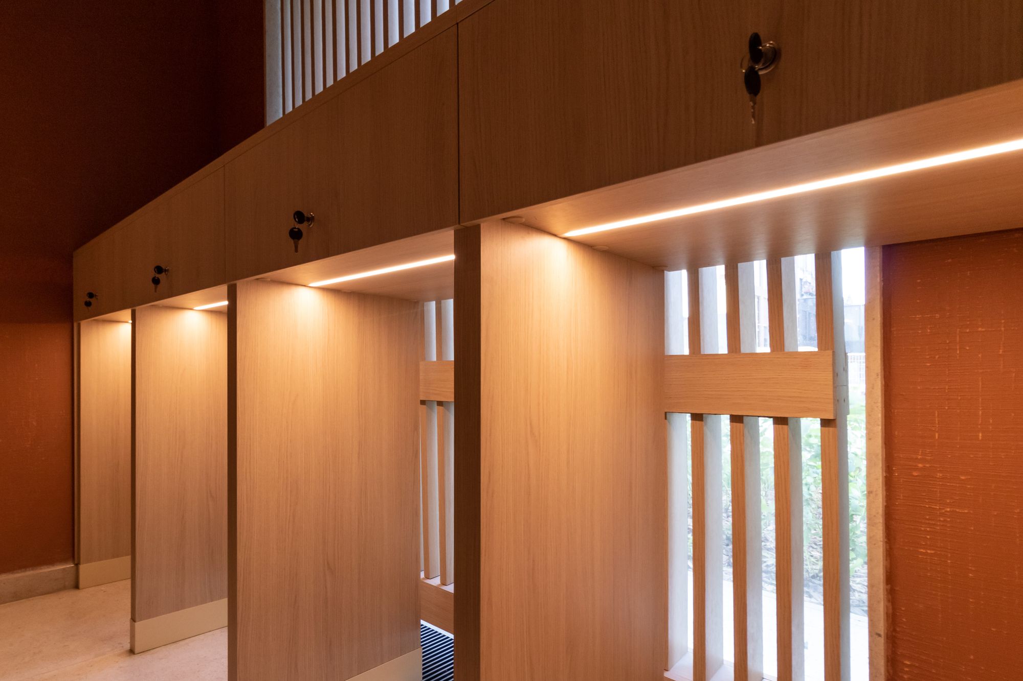 Для удобства жильцов на первом этаже расположены санузел, колясочная и мойка для собак. В некоторых помещениях для экономии электроэнергии установлены датчики движения и также задан световой сценарий: при отсутствии движения подсветка светит всего на 3%, а светильники выключены. При возникновении движения яркость подсветки увеличивается до 100%, а светильников — до 20%.