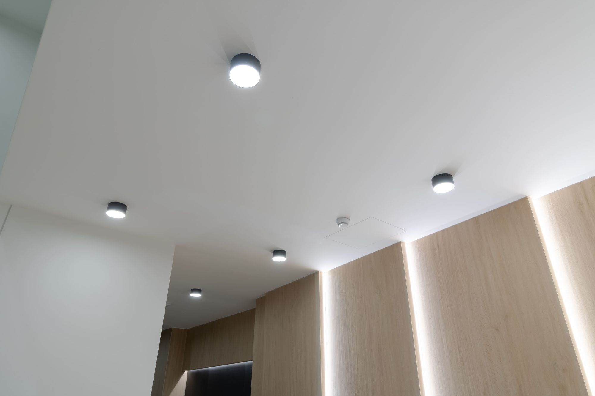 Для создания основного освещения в МОП активно применяются накладные светильники RONDO. Они обладают высоким индексом цветопередачи (CRI>90), что позволяет точно передавать цветовую гамму окружающих предметов. Благодаря матовому рассеивателю из поликарбоната получается мягкое и комфортное для глаз свечение, которое не образует резких бликов. В целом места общего пользования выполнены в черно-белой цветовой гамме и частично отделаны светлым деревом: цилиндрические светильники RONDO в черном цвете гармонично вписываются в пространство.