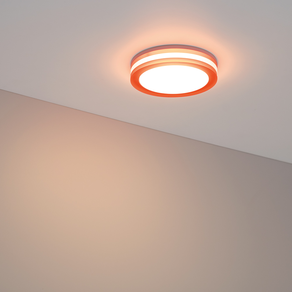 Круглый светильник с контурным свечением. Корпус белый с морковно-оранжевым + вставка поликарбонат PC. Цвет БЕЛЫЙ ДНЕВНОЙ 4000К, св.поток 400 лм, угол 120°+180°. Питание 110-240VAC, 5Вт, 300mA 15-18V, драйвер в комплекте. Размеры 80х40 мм, установка в отв.65 мм, высота мин.40 мм.