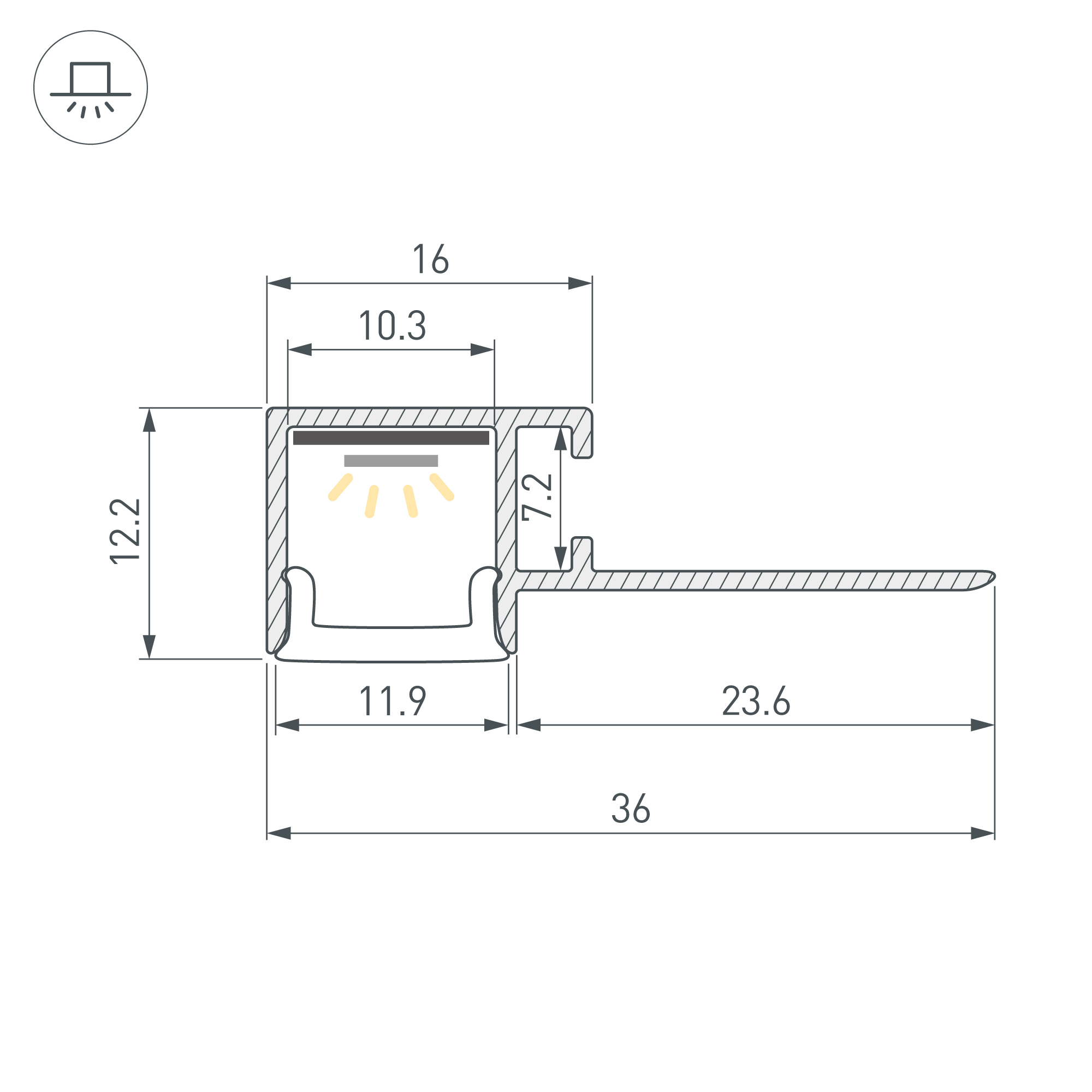 Алюминиевый встраиваемый профиль для светодиодных лент и линеек. Габаритные размеры (L×W×H): 2000х36,2х13 мм. Ширина площадки для ленты 10,3 мм. Экраны, заглушки и другие аксессуары приобретаются отдельно. Цена за 1 метр.