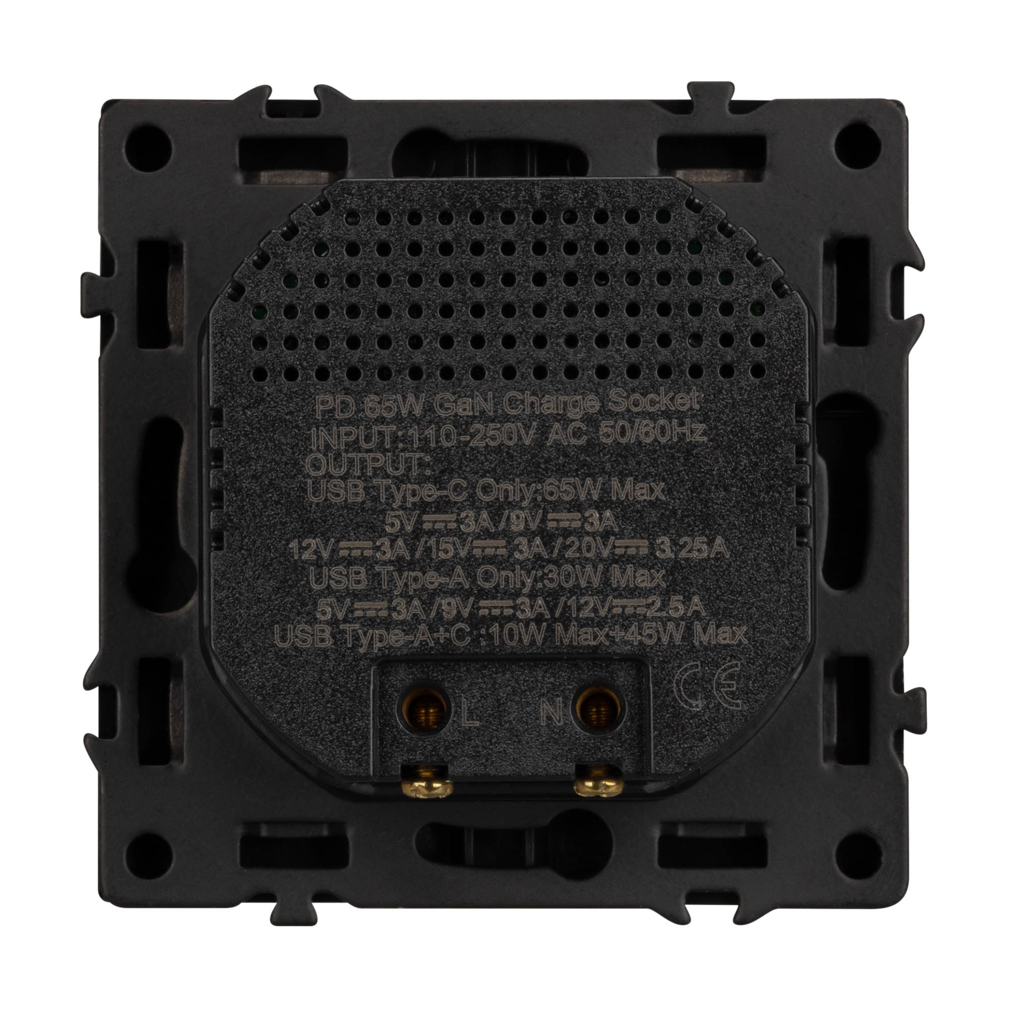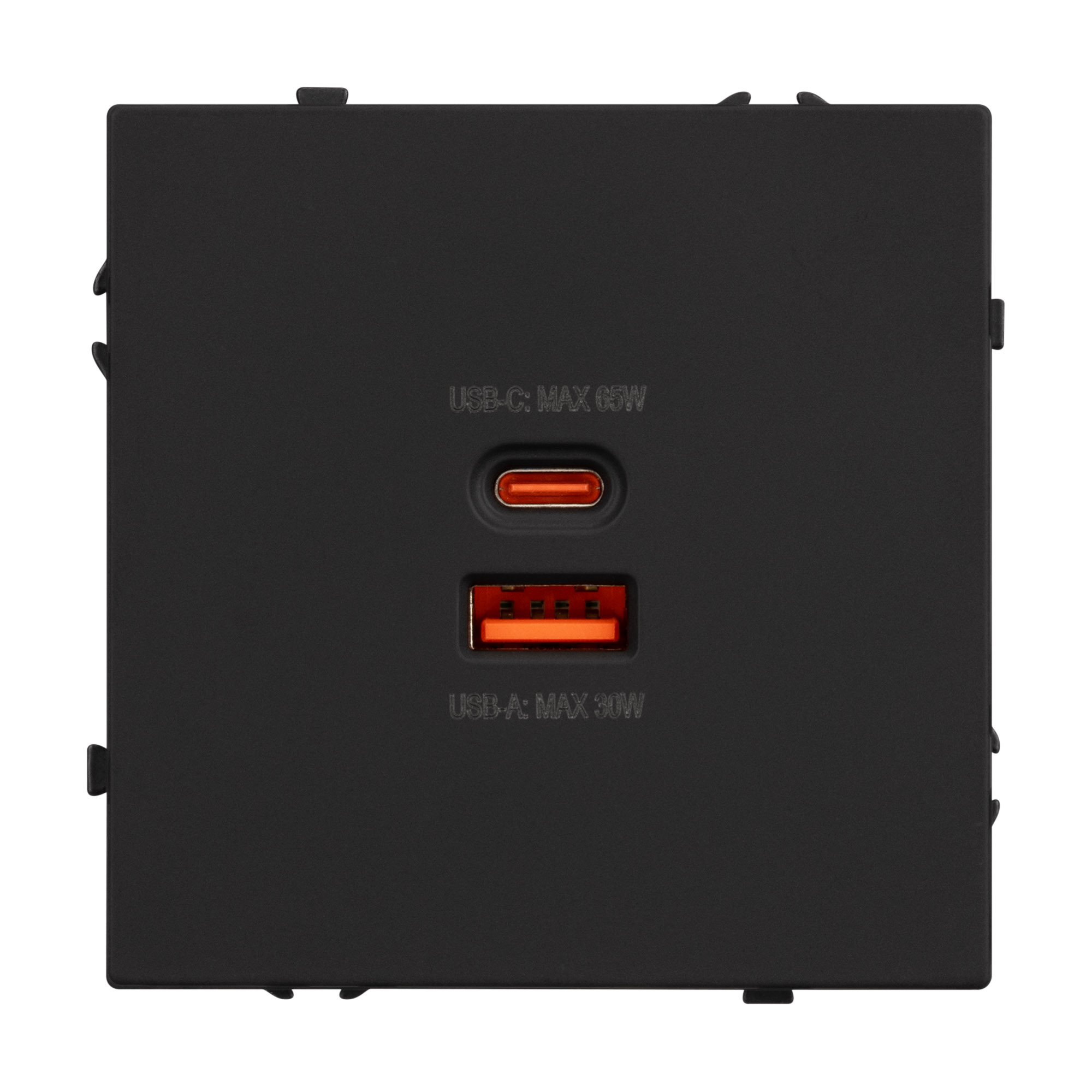 Механизм розетки с быстрой USB зарядкой на 2 порта. Цвет - черный, с Soft-Touch покрытием. Без фронтальной рамки. Уровень пылевлагозащиты IP20. Тип подключаемого разъема - USB Type A + Type C. Устанавливается в стандартный подрозетник круглого сечения диаметром 60мм. Габаритные размеры: длина 71 мм, ширина 71 мм, высота 42 мм. Гарантийный срок 10 лет.