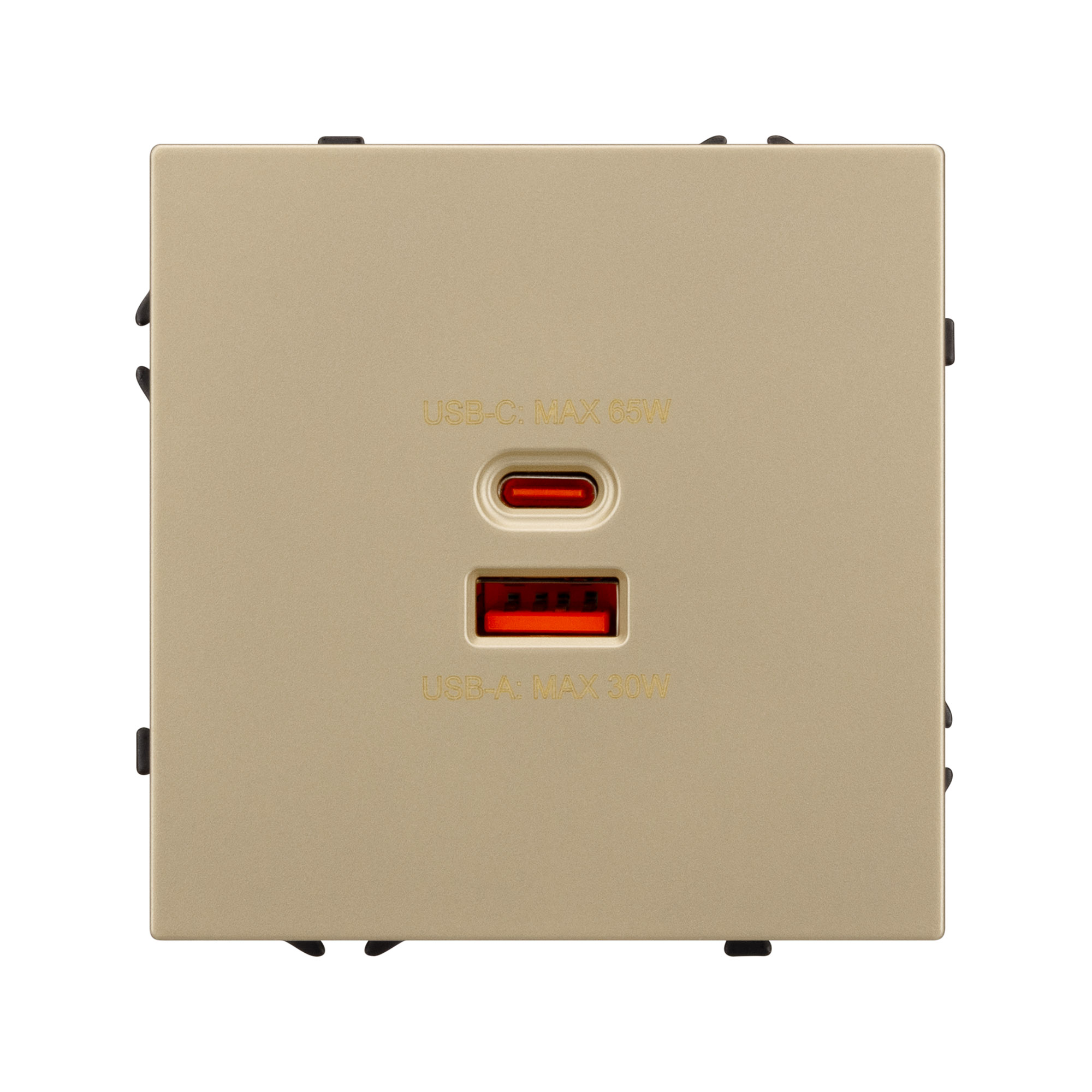 Строгие геометрические линии гармонично сочетаются с функциональностью продуманных механизмов, создавая идеальное решение для дизайн-проектов, где важны как эстетика, так и практичность. Механизм розетки с быстрой USB зарядкой, совместимый с рамками серии NOBE, создает утонченный минималистичный вид. Наличие USB Type A и Type C портов позволяет существенно сократить количество используемых розеточных постов под евровилку, сохраняя единую стилистику интерьера всего современного дизайн-проекта. Оба разъема поддерживают протокол быстрой зарядки Quick Charge QC 3.0, помимо этого для разъема Type C доступен протокол Power Delivery*. Выходные параметры для данных типов портов при этом составляют 30W и 65W соответственно. Видимая часть механизма выполнена из высококачественного пластика золотого цвета и имеет Soft-Touch покрытие, что придает изделию приятные тактильные ощущения и стильный внешний вид. Контактная часть присоединяется при помощи винтовых зажимов, позволяя надежно подсоединить механизм выключателя к питающим элементам. Суппорт окрашен в черный матовый цвет под основу механизма и выполнен из металла толщиной 1,5мм, что обеспечивает безопасность и уверенность в установке. На каждой стороне суппорта размещены фиксирующие элементы, позволяющие комбинировать механизмы в системы до 5шт как горизонтально, так и вертикально. *Для активации функции быстрой зарядки необходимо использовать специализированный зарядный кабель, который предназначен для работы с зарядными устройствами повышенной мощности.