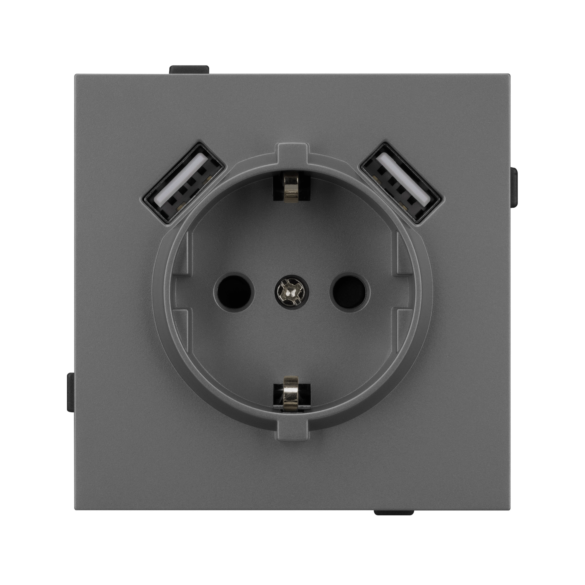 Механизм розетки с USB зарядкой, совместимый с рамками серии NOBE, создает утонченный минималистичный вид. Наличие двух USB Type A портов позволяет существенно сократить количество используемых розеточных постов под евровилку, сохраняя единую стилистику интерьера всего современного дизайн-проекта. Видимая часть механизма выполнена из высококачественного пластика серого цвета и имеет Soft-Touch покрытие, что придает изделию приятные тактильные ощущения и стильный внешний вид.