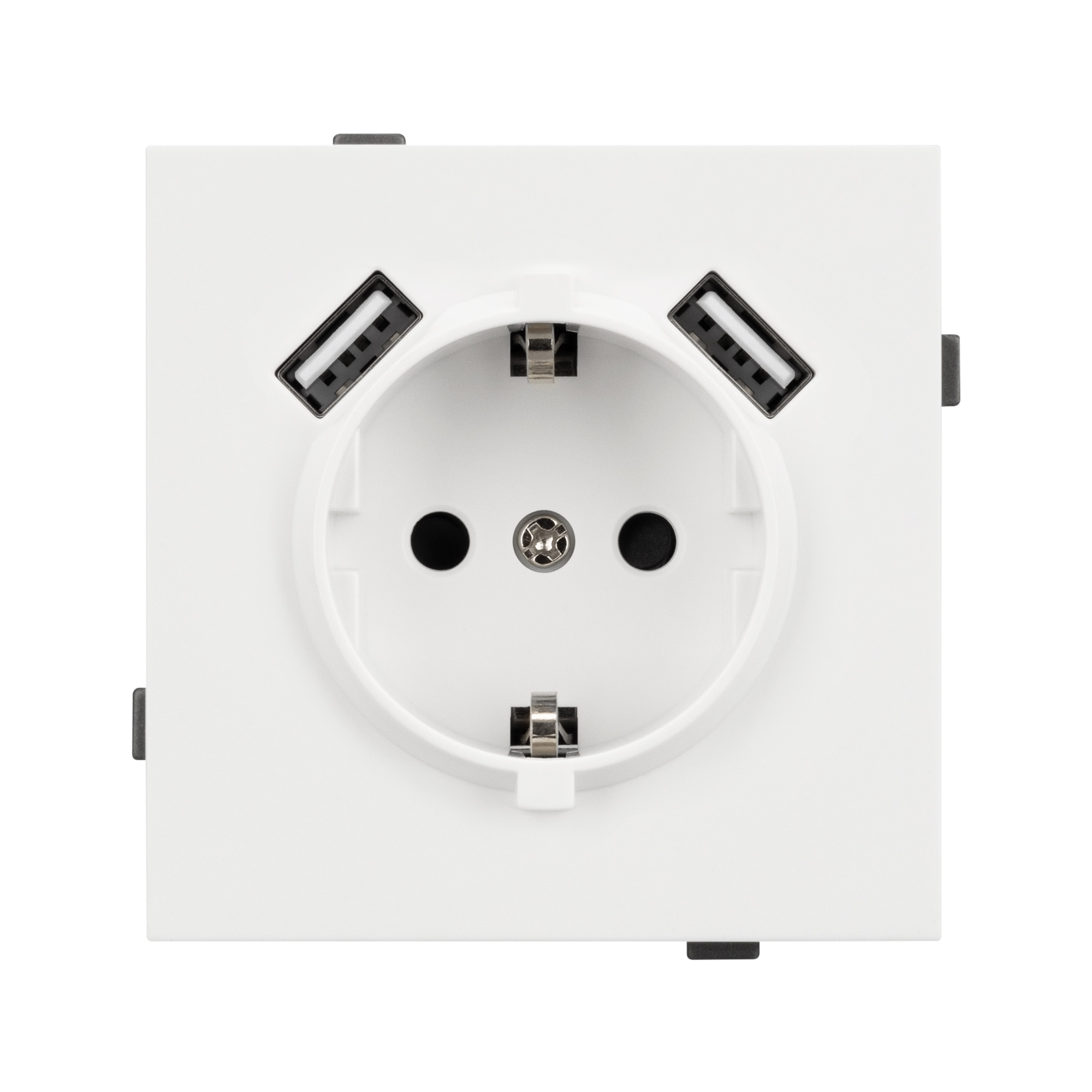 Механизм розетки с USB зарядкой, совместимый с рамками серии NOBE, создает утонченный минималистичный вид. Наличие двух USB Type A портов позволяет существенно сократить количество используемых розеточных постов под евровилку, сохраняя единую стилистику интерьера всего современного дизайн-проекта. Видимая часть механизма выполнена из высококачественного пластика белого цвета и имеет Soft-Touch покрытие, что придает изделию приятные тактильные ощущения и стильный внешний вид.