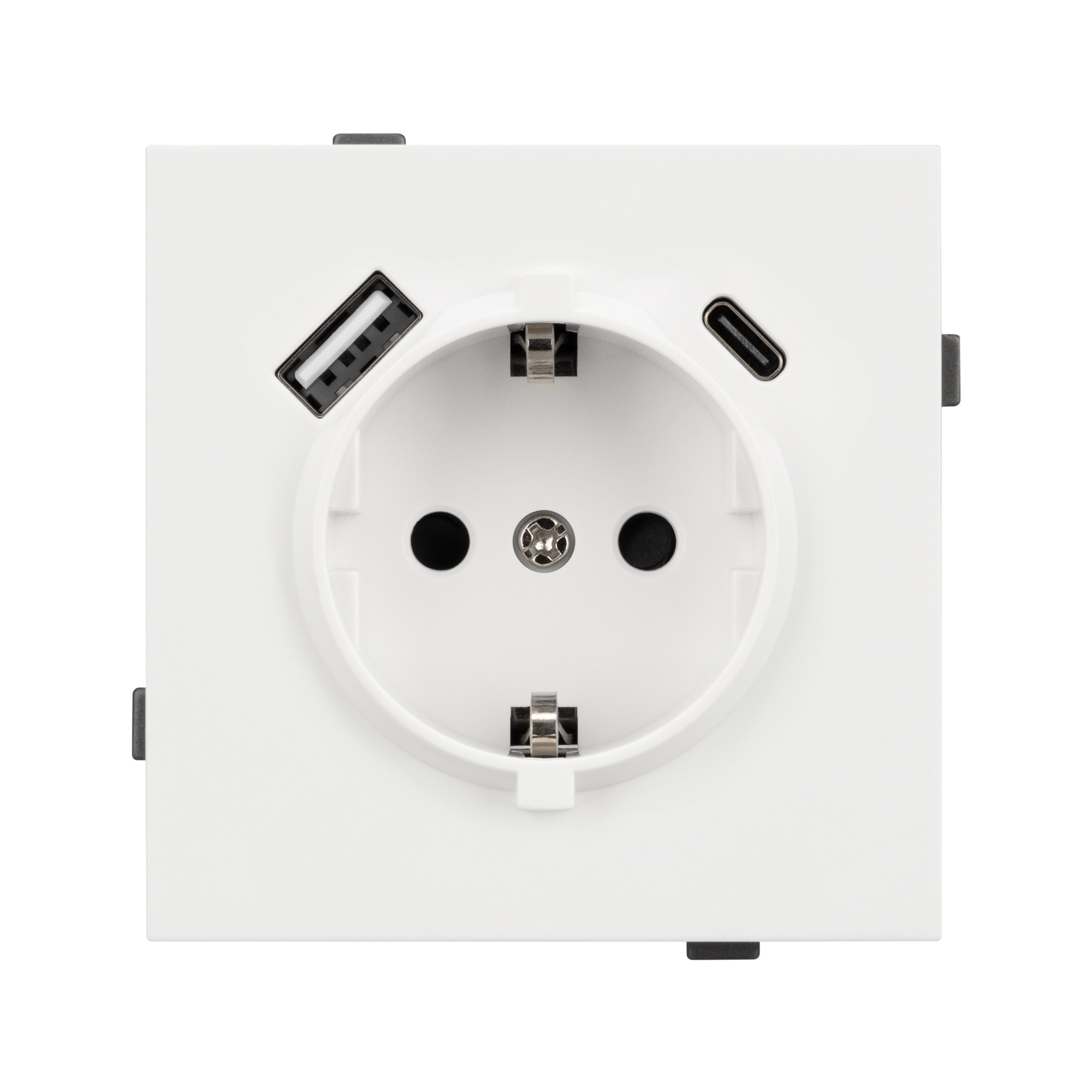 Механизм розетки с USB зарядкой, совместимый с рамками серии TENDO, создает утонченный минималистичный вид. Наличие двух USB Type A + Type C портов позволяет существенно сократить количество используемых розеточных постов под евровилку, сохраняя единую стилистику интерьера всего современного дизайн-проекта. Видимая часть механизма выполнена из высококачественного пластика белого цвета и имеет Soft-Touch покрытие, что придает изделию приятные тактильные ощущения и стильный внешний вид.
