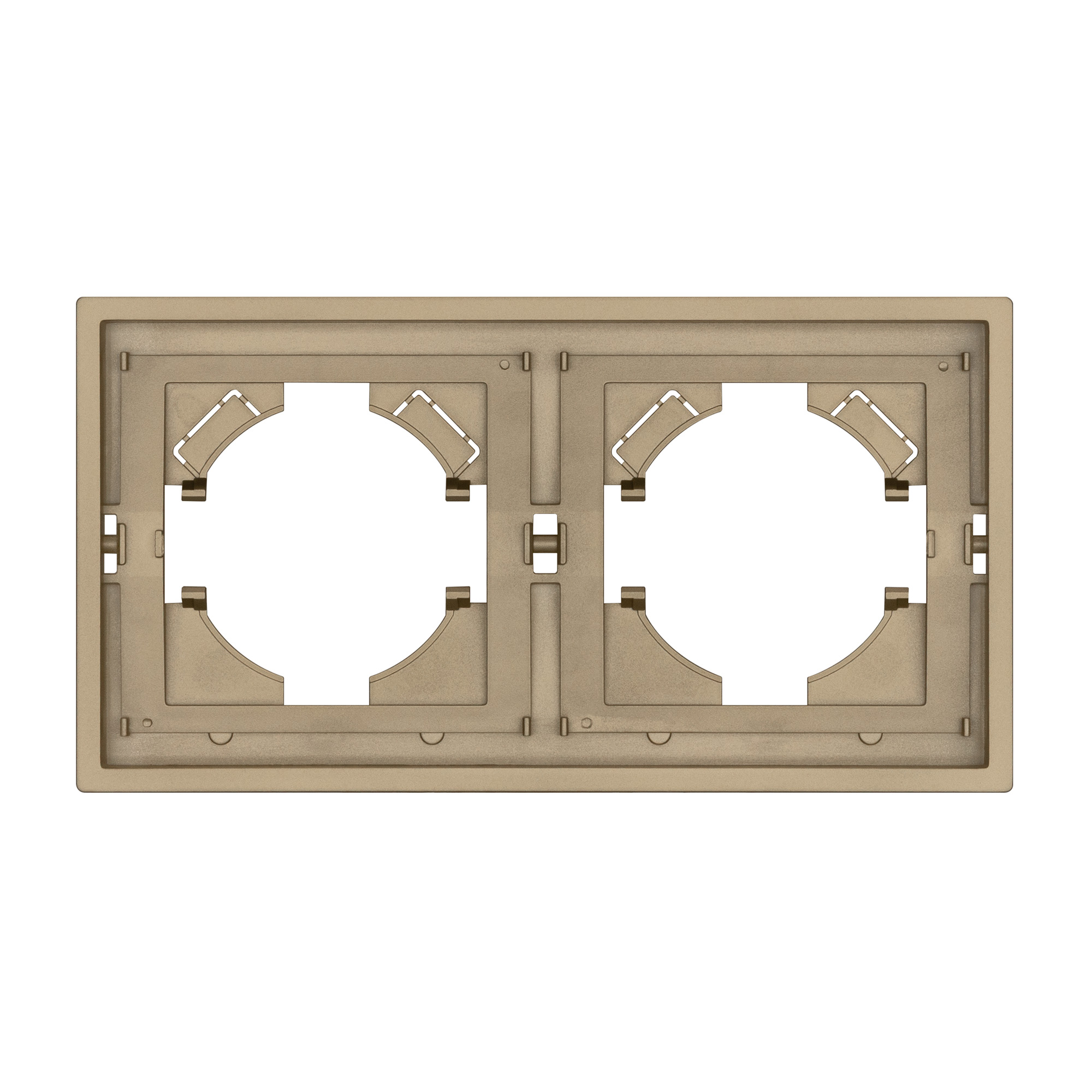 Рамка пластиковая на 2 поста, под встраиваемый механизм. Цвет - золотой, с Soft-Touch покрытием. Среднего уровня герметичности IP20. Ориентация монтажа горизонтальная. Габаритные размеры: длина 150 мм, ширина 80 мм, высота 9 мм. Гарантийный срок 12 мес.