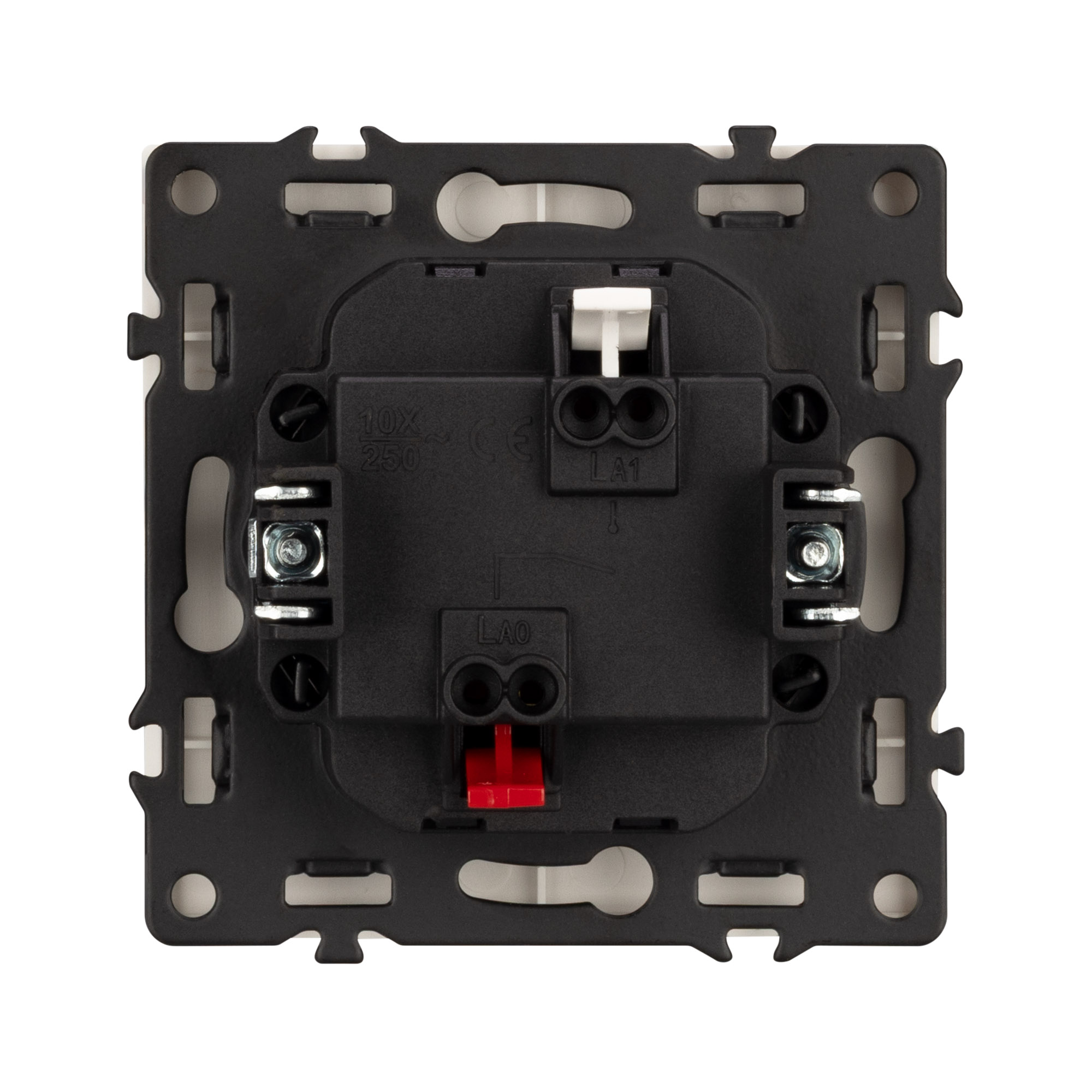 Соединение посредством быстрозажимных контактов, позволяет надежно подсоединить механизм выключателя к питающим элементам, минимизируя затраченное время на монтаж. А усиленные распорные лапки двойного захвата надежно фиксируют механизм в установочном подрозетнике круглого сечения диаметром 60мм.