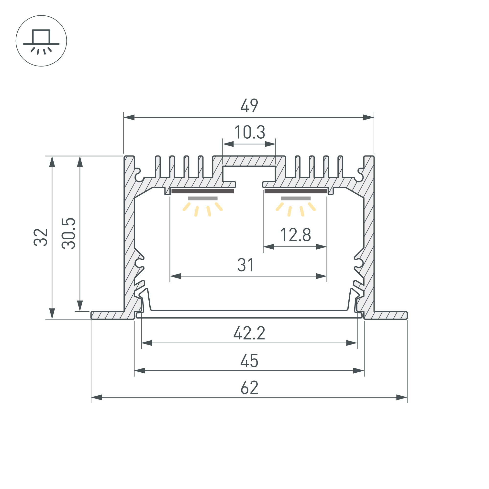 Встраиваемый профиль с накладным фланцем из анодированного алюминия для основной и контурной подсветки помещений. Габаритные размеры профиля составляют 3000 мм в длину, 62 мм в ширину и 32 мм в высоту, паз для установки 49 мм. Площадка для установки светодиодных лент позволяет использовать ленту шириной до 31 мм и мощностью до 46,4 Вт/м. Это обеспечивает гибкость в выборе светодиодных лент и создает потрясающие световые решения. Экраны, заглушки и другие аксессуары не включены в комплект и приобретаются отдельно. Цена указана за 1 метр профиля. Отличное решение для создания современных световых проектов.