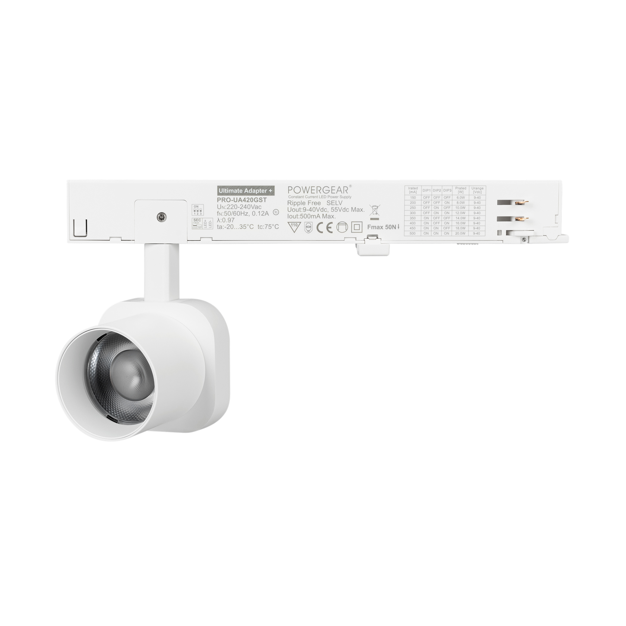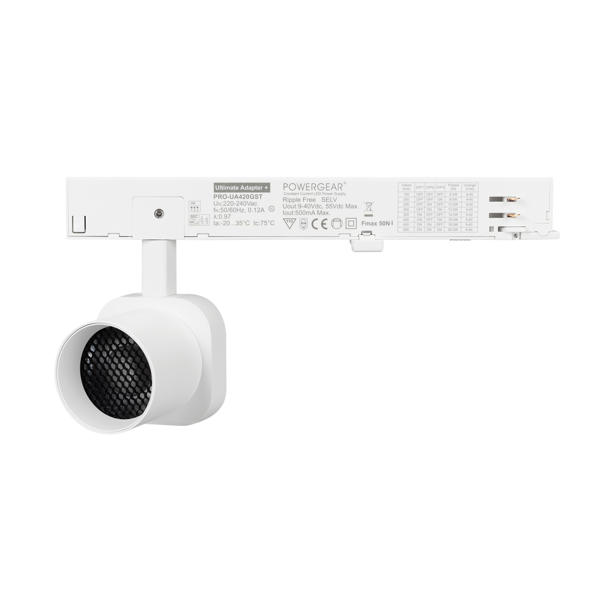 Светильник для треков/шин 4 провода. Мощность 10 Вт, св. поток 740 лм, 74 лм/Вт, теплый 2700 K, CRI>95, угол 60°, напряжение питания 230 В. Решетка HONEYCOMB в комплекте. Белый квадратный корпус из алюминия, материал линзы PC поликарбонат, степень защиты IP20. Размер световой части 60х60х62 мм. Монтаж на трек 3-фазный. Драйвер встроенный 9-40 В, 250мА., пульсация <1%