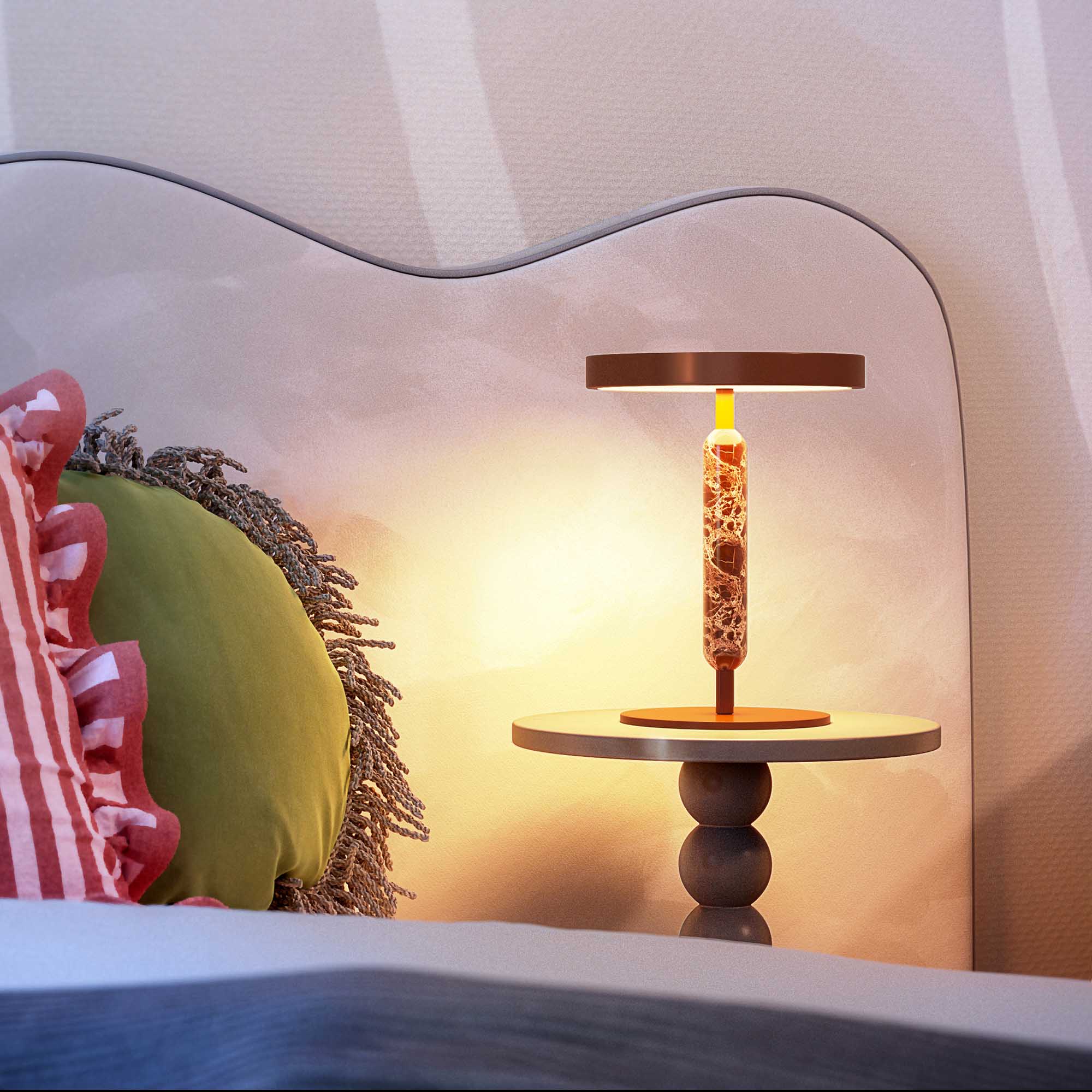 Настольный светильник ALYSS. С изменяемой цветовой температурой 2700/3200/4000К. Цт переключается коротким нажатием на сенсорную кнопку на плафоне, диммирование происходит за счет ее удержания. Мощность 5 Вт, св. поток 195 лм, 39 лм/Вт, CRI>92, угол 110°, напряжение питания 230 В. Корпус из алюминия цвета бургунди, декоративная вставка из мрамора, степень защиты IP20. Размер: диаметр 225 мм, высота 300 мм. Пульсация <1%.