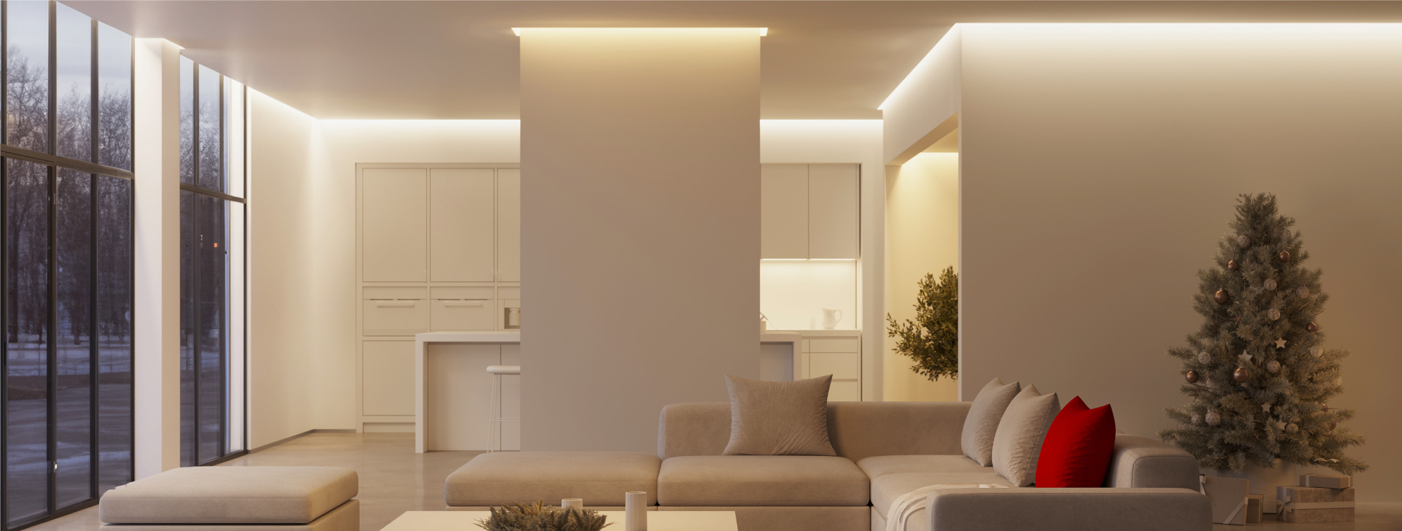 Теневой зазор Мягкие декоративные линии без подсветки в месте стыковки гипсокартонного потолка со стеной.