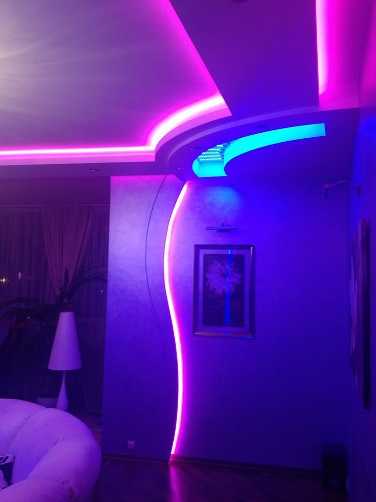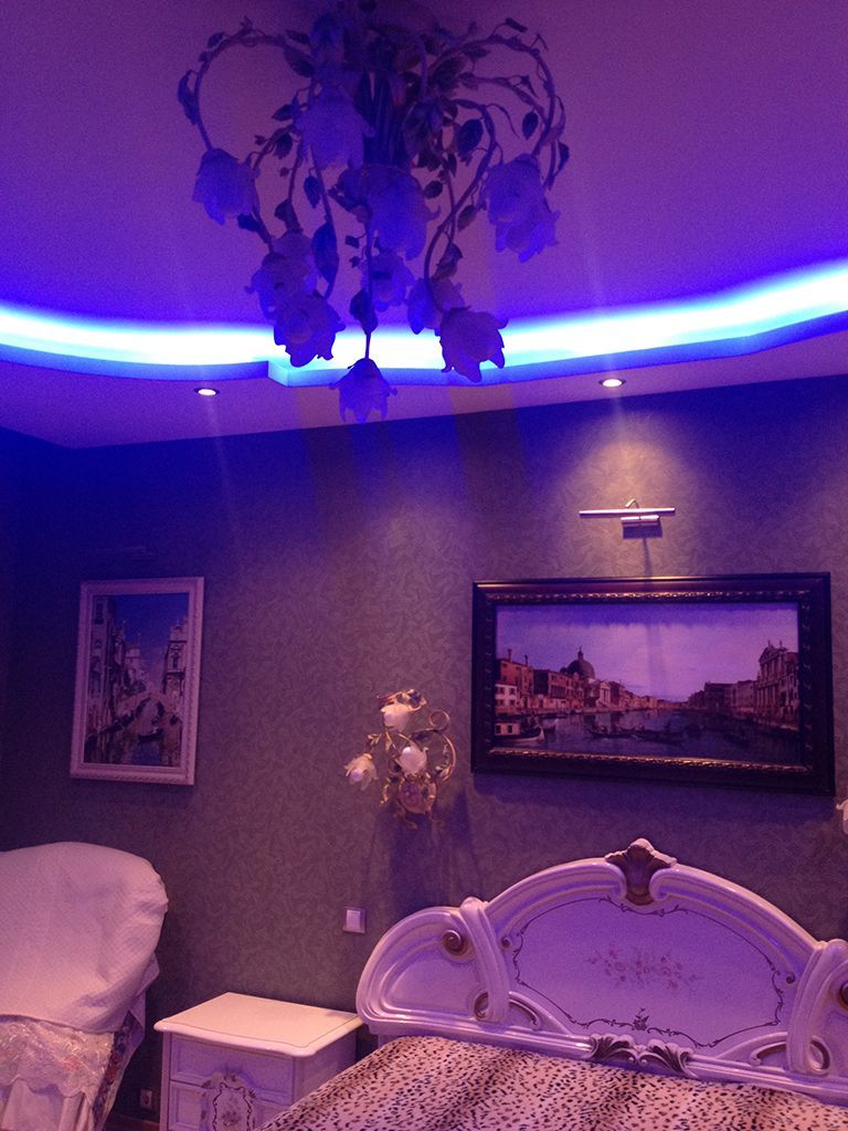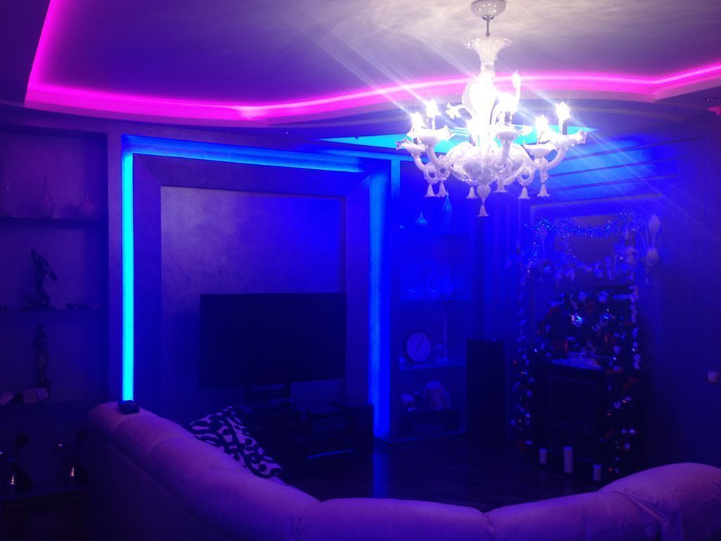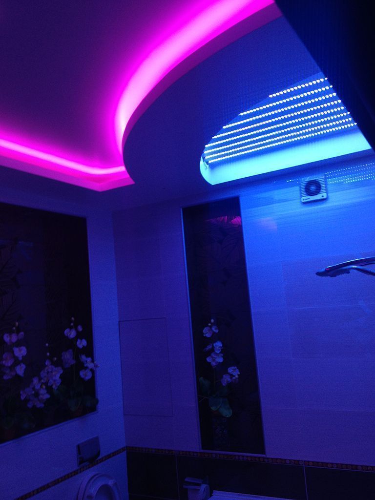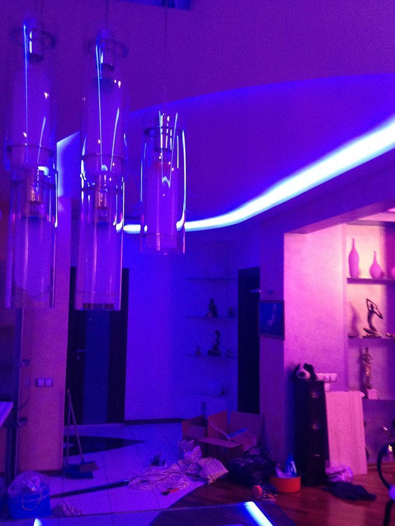 Многоцветная RGB подсветка была установлена во многочисленных нишах во всех частях квартиры: прихожей, гостиной, спальных комнатах и даже ванной.