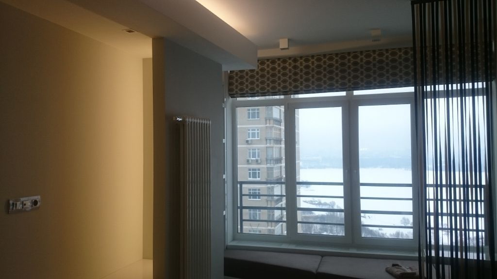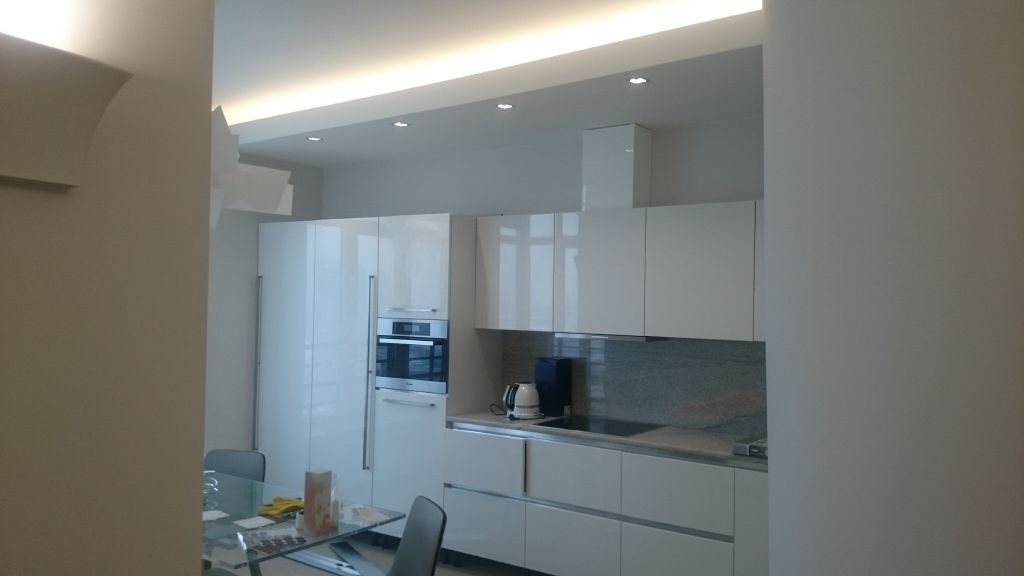 Подсветка потолков в данной квартире служит в основном в декоративных целях, то подсветка других зон функциональна. Основная из зон - это, конечно же, кухня, в которой была установлена подсветка всей рабочей поверхности - столешницы. Она установлена под верхними навесными шкафами и организована из светодиодной ленты и светодиодного профиля с матовым экраном, рассеивающим свечение ленты, делающим его более равномерным и защищающим ленту от попадания брызг. Включать и выключать подсветку, регулировать её яркость можно не нажимая кнопок, просто поднеся руку к бесконтактному датчику, что очень удобно когда руки заняты или мокрые.