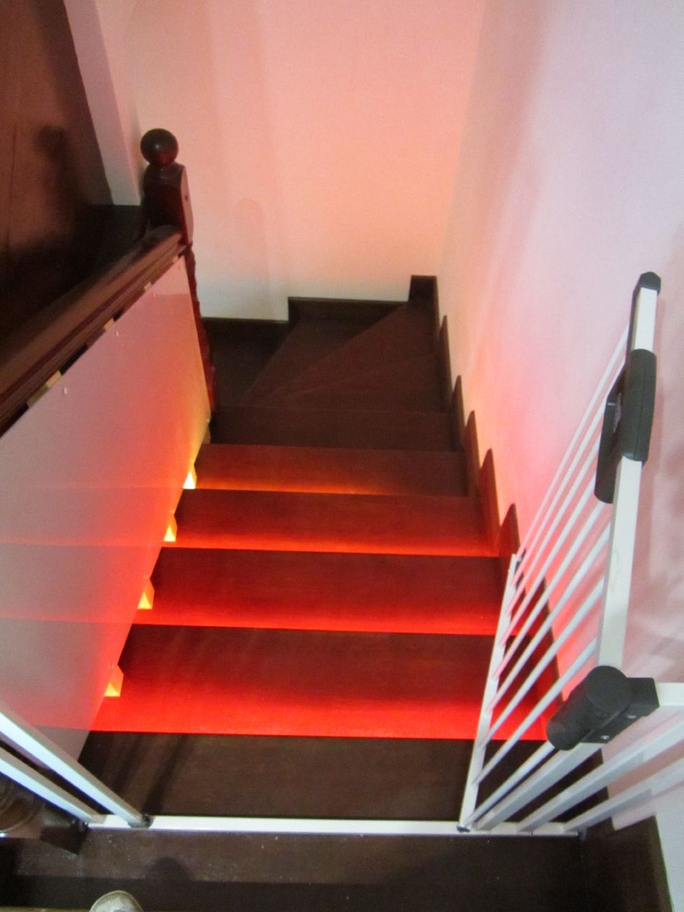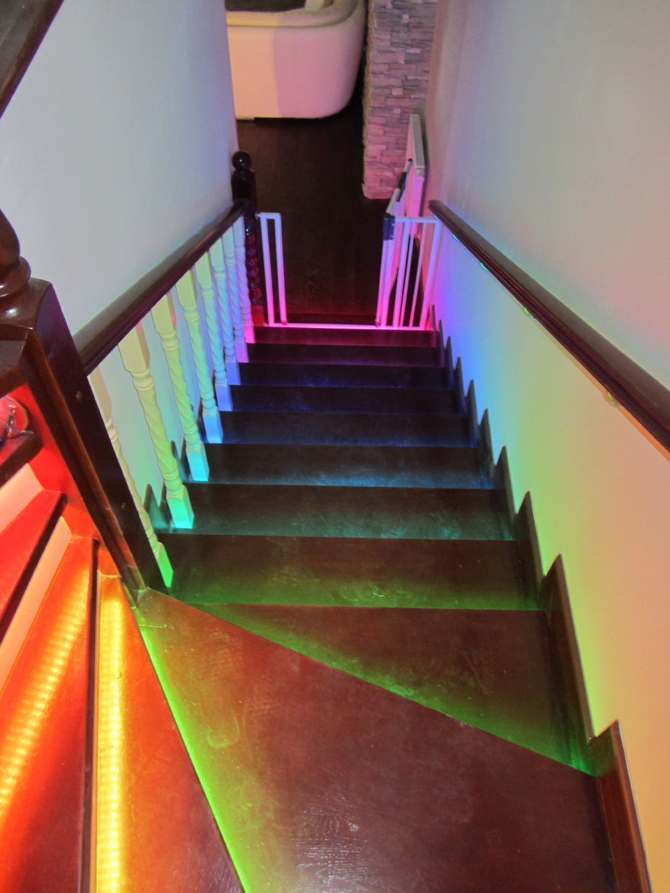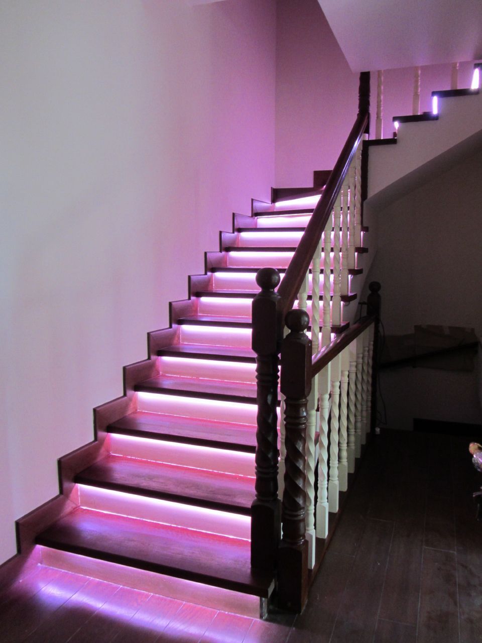 Многоцветная светодиодная подсветка лестницы в частном доме в коттеджем поселке "Белый Берег"