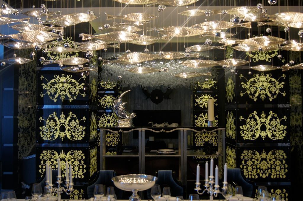 Оригинальность основного освещения достигнута благодаря использованию нестандартных, разнообразных люстр в виде рыбок, кораблей, колючих или, наоборот, мягких и плавных форм, неоспоримо привлекающих к себе внимание и являющихся акцентами в интерьере, в том числе, благодаря использованию в них светодиодной подсветки.