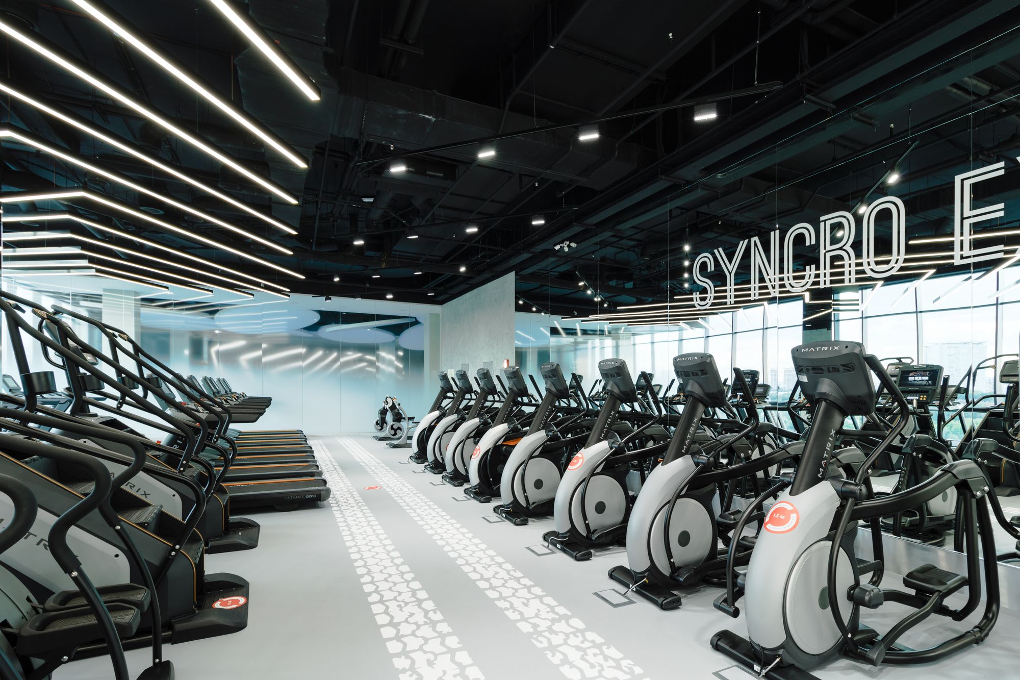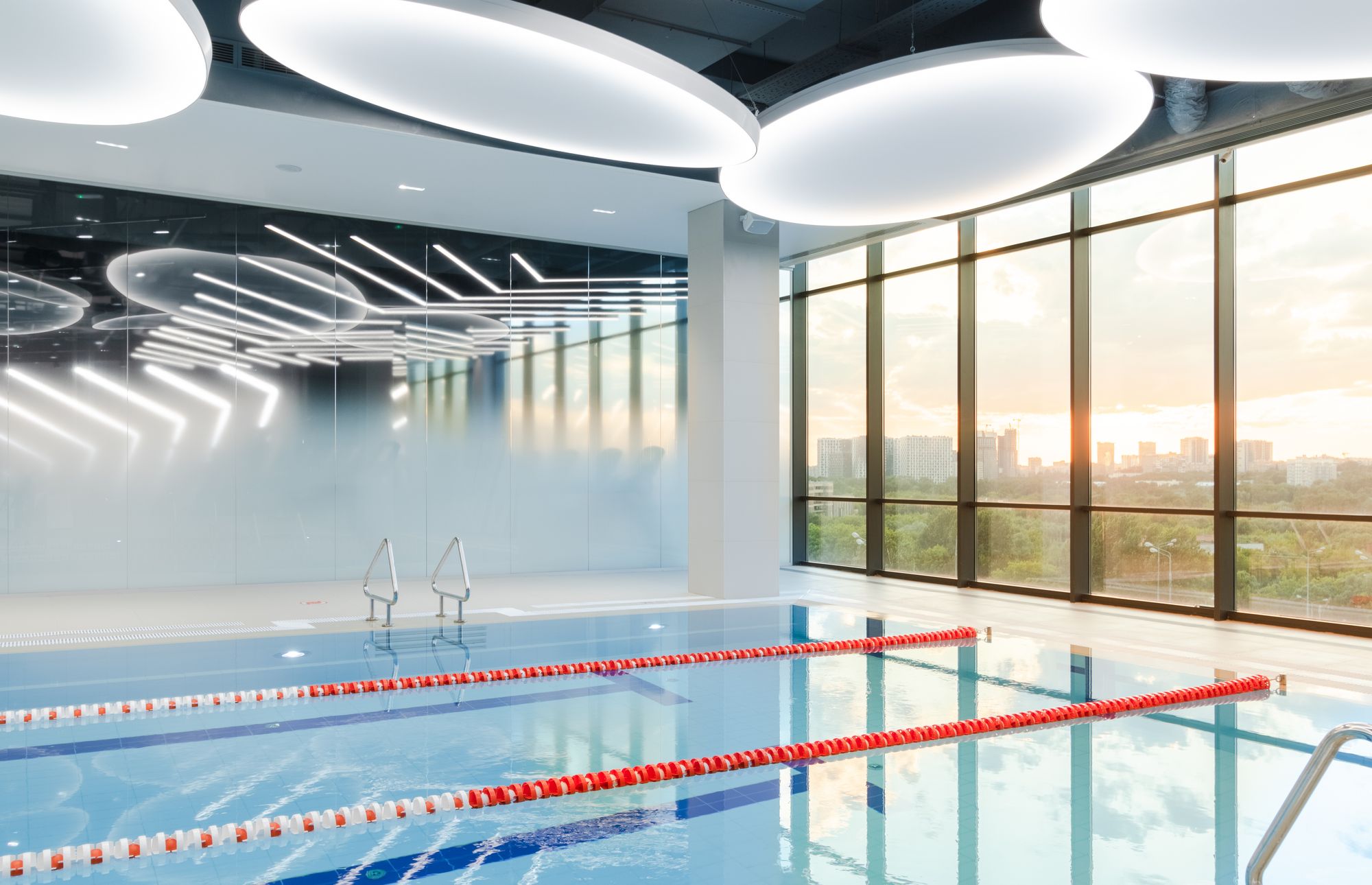 Уникальное пространство, в котором интересно сочетаются разные типы основного освещения и декоративной подсветки. Для проекта было использовано более 30 единиц светодиодного оборудования. Огромные потолочные диски светильников сочетаются с линейными и дизайнерскими подвесными светильниками. С помощью света удалось подчеркнуть масштаб, красоту и легкость интерьеров. Круглые потолочные светильники в зоне бассейна похожи на полную луну. Ломаные линии света напоминают летящие стрелы или разметку бегового стадиона. Светодизайнерам удалось создать пространство, в котором сплелись качественный белый свет и световые иллюзии.