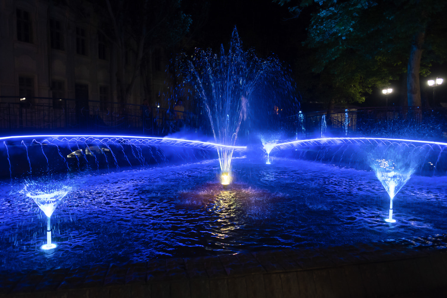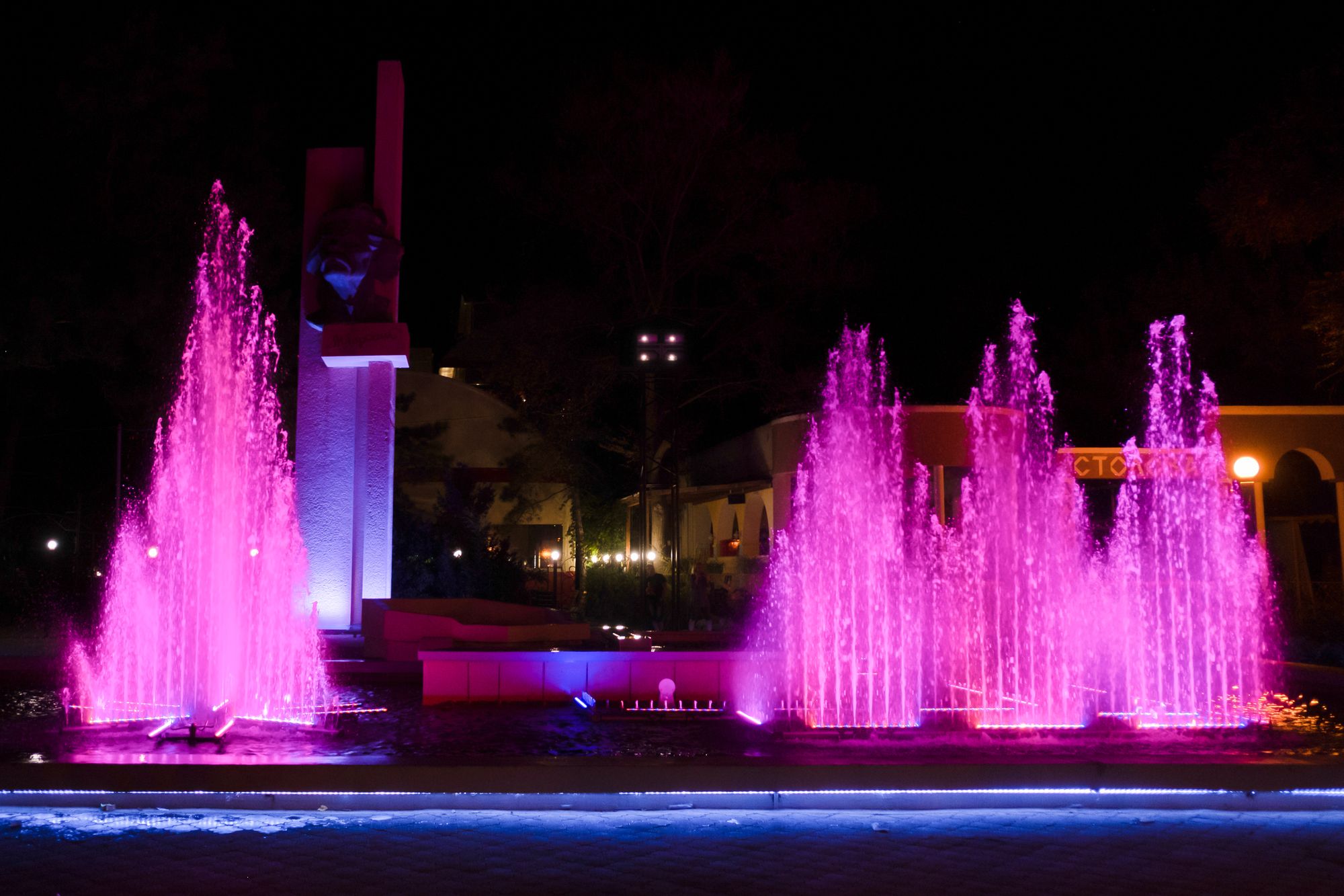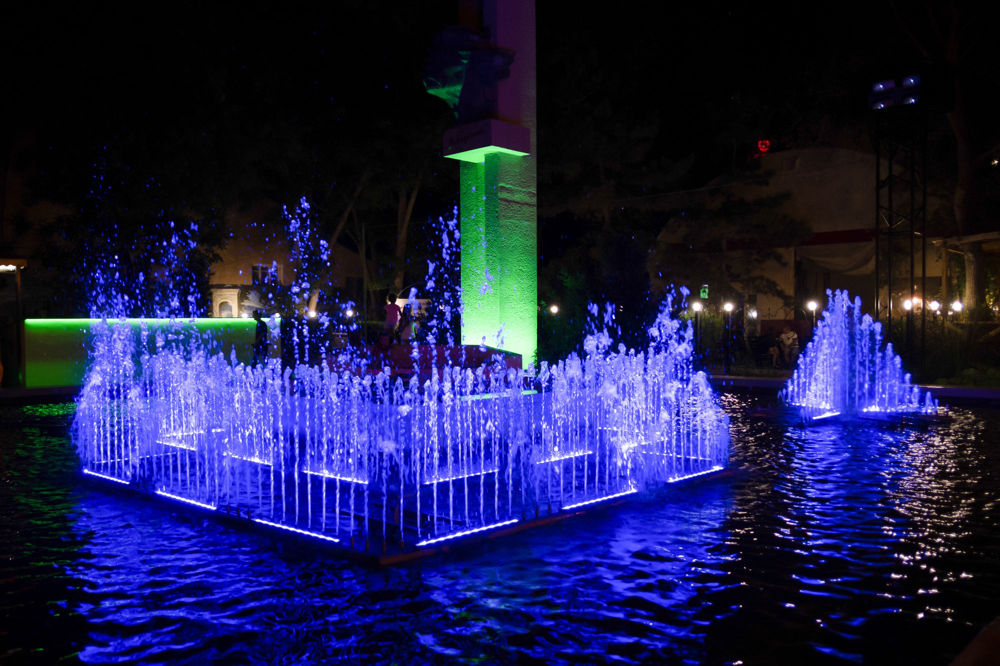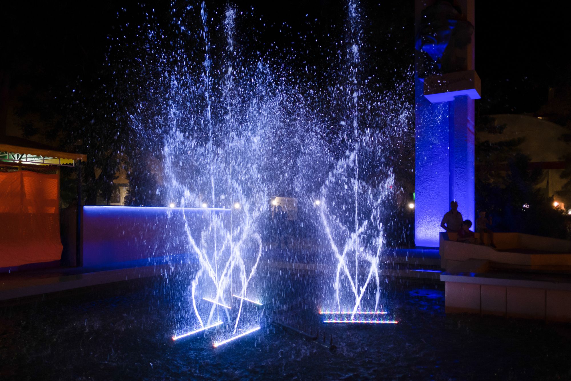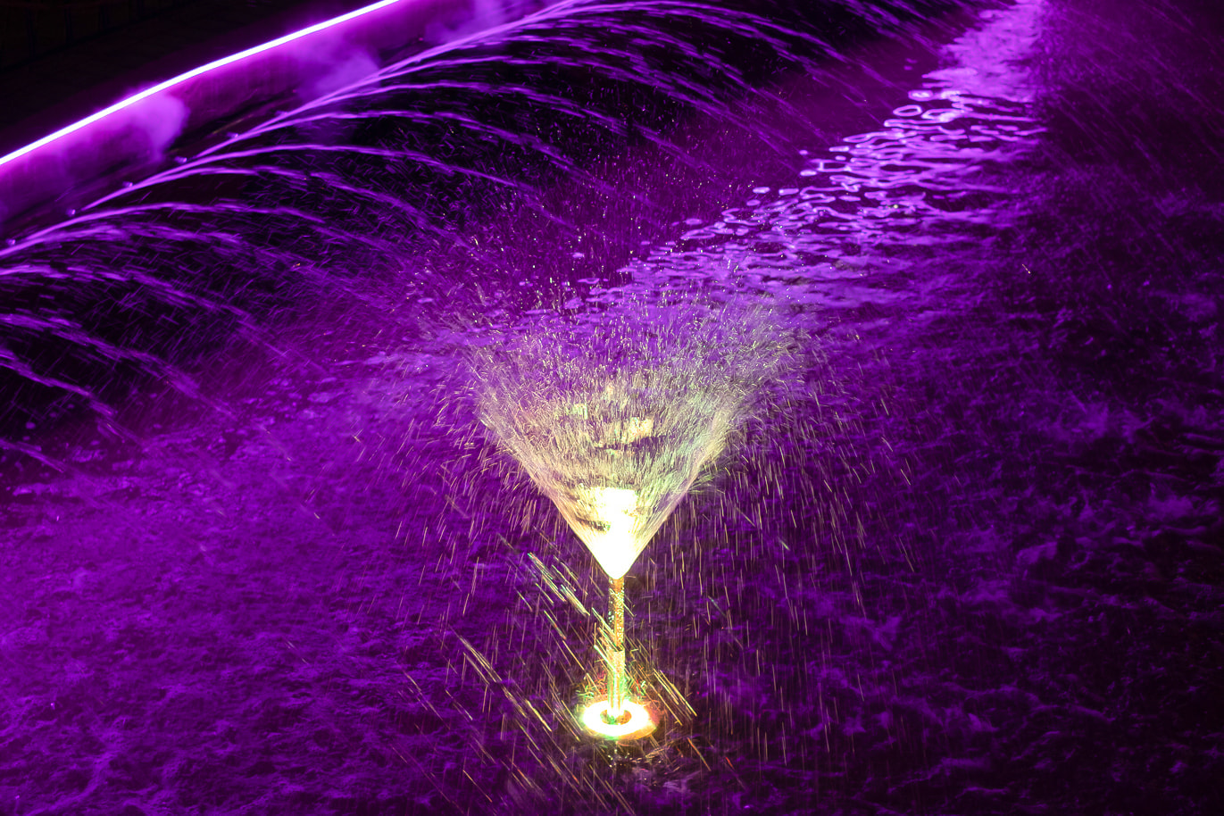 Грандиозный светомузыкальный проект реализован с помощью герметичных RGB-лент лент с высокой степенью пылевлагозащиты IP67. Фонтан оснащен полноценной системой освещения и озвучивания, которая позволяет воспроизводить эффектные цветомузыкальные фонтанные паттерны. Управление цветом свечения и динамическими сценариями осуществляется с помощью контроллера. Система управления основана на синхронизации с музыкой по темпу и стилю. Все фигуры фонтана укомплектованы сухими насосами, влагозащищенной системой управления и световой системой с безопасным напряжением 24 В..