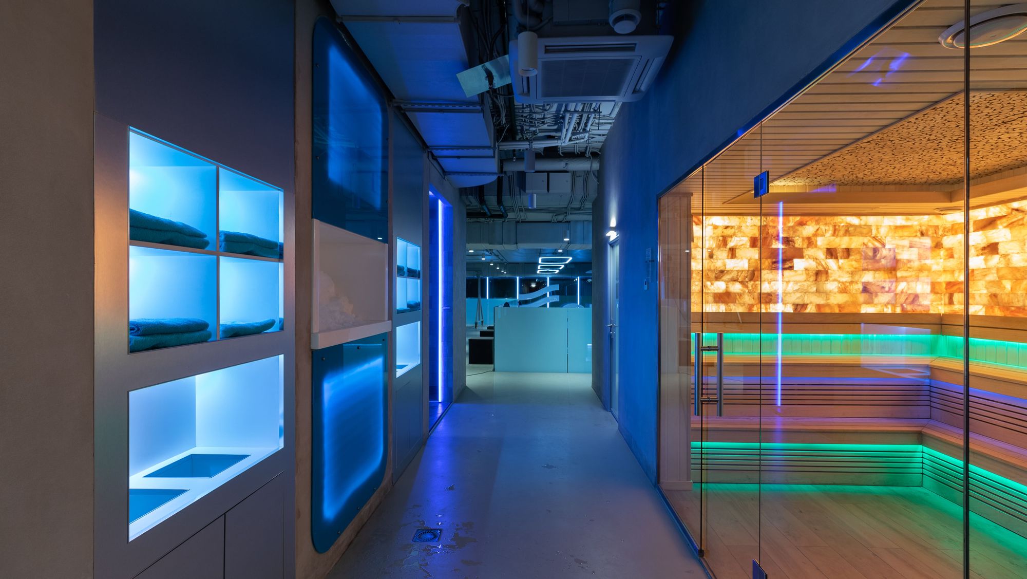 Современный дизайн и продуманные до мелочей сценарии освещения. Свет в этом проекте впечатляет вариативностью решений и оригинальными сочетаниями. «Море цвета и света» становится девизом клуба. Вода, отражающая свет RGB-лент, превращается в полотно для красочных рисунков.
