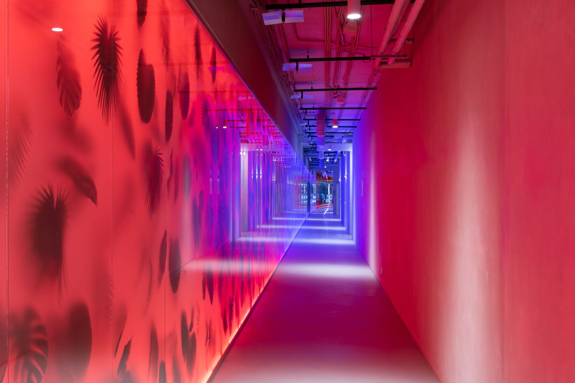 Ручное управление группами светильников, автоматическая смена сцен освещения в течение дня и общее управление всеми источниками света осуществляется с помощью планшета на стойке администратора. В офисном помещении, фитнес-зале и зоне отдыха сделано более спокойное нейтральнее освещение при помощи лент белого свечения.