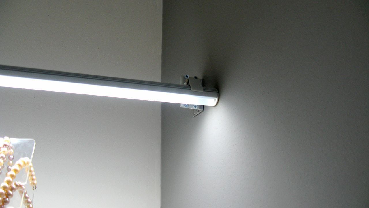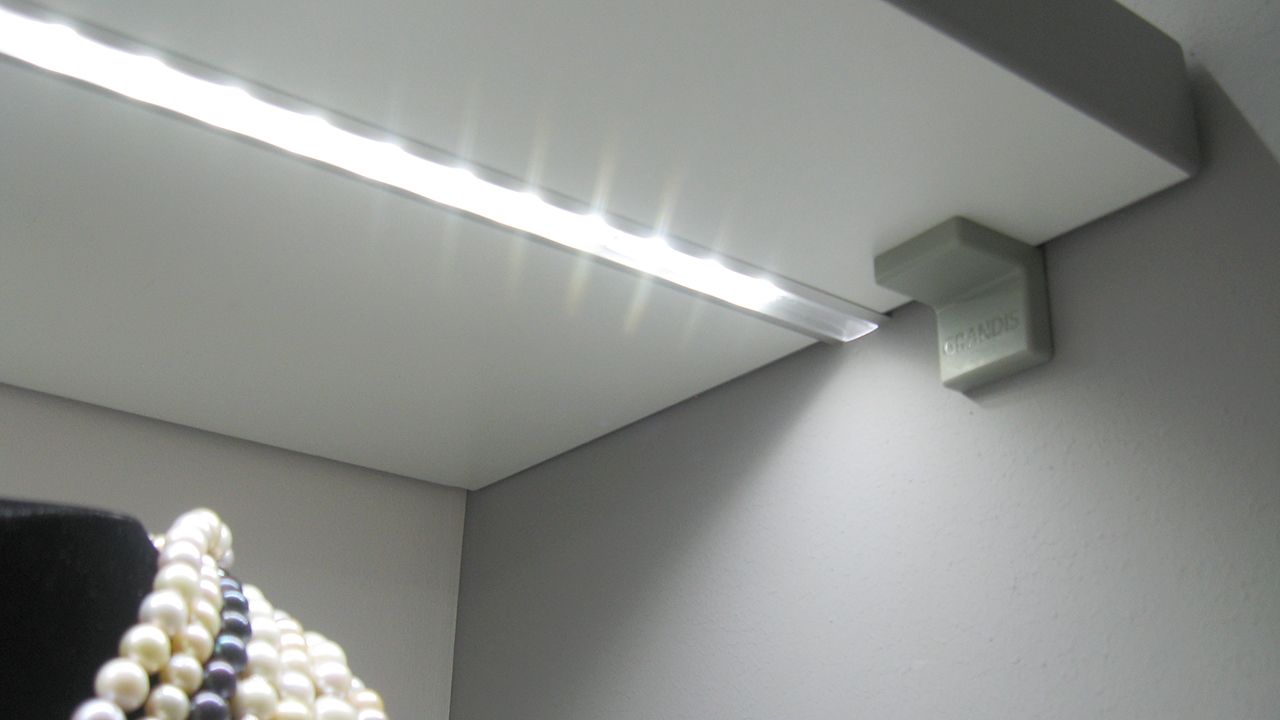 А самое интересное - подсветка витрин, для этого использованы алюминиевые светодиодные профили. Подсветка нижних уровней была реализована при помощи врезных профилей, которые вмонтированы в нижнюю сторону полок. Подсветка верхнего уровня, над которым полок нет, выполнена с использованием круглого профиля, держатели которого позволяют регулировать направление свечения. В качестве источника света в профилях используется светодиодная лента Arlight чистого белого цвета свечения, который отлично подходит для освещения ювелирной продукции.