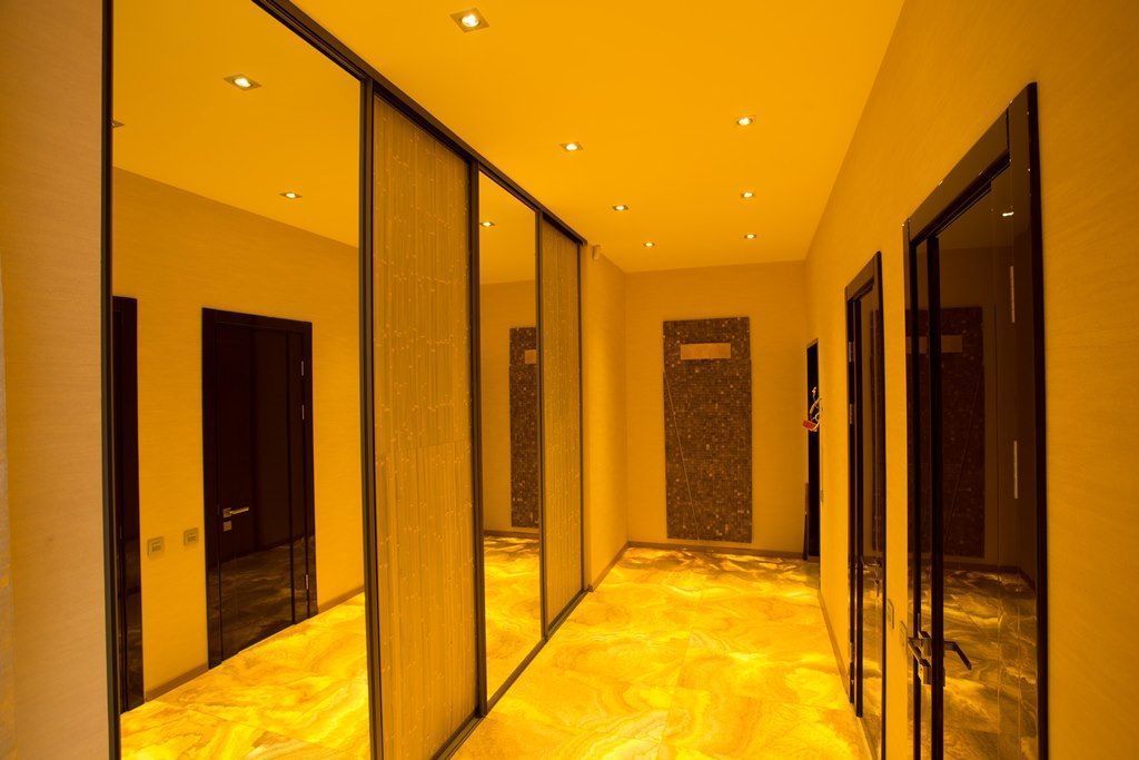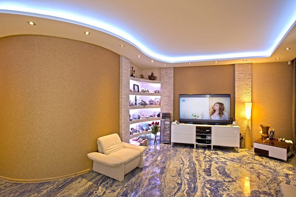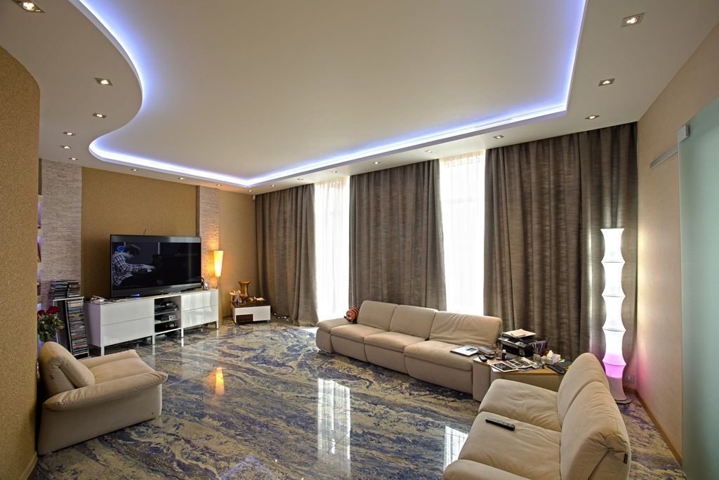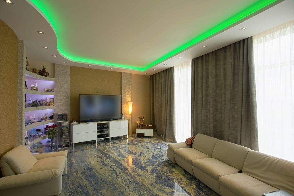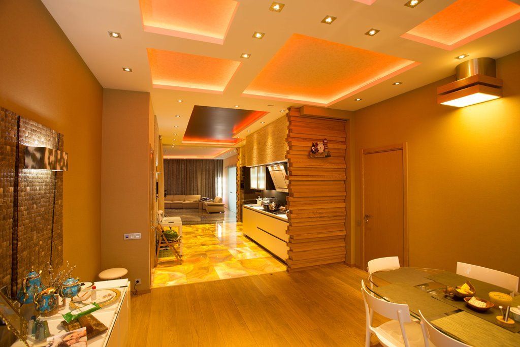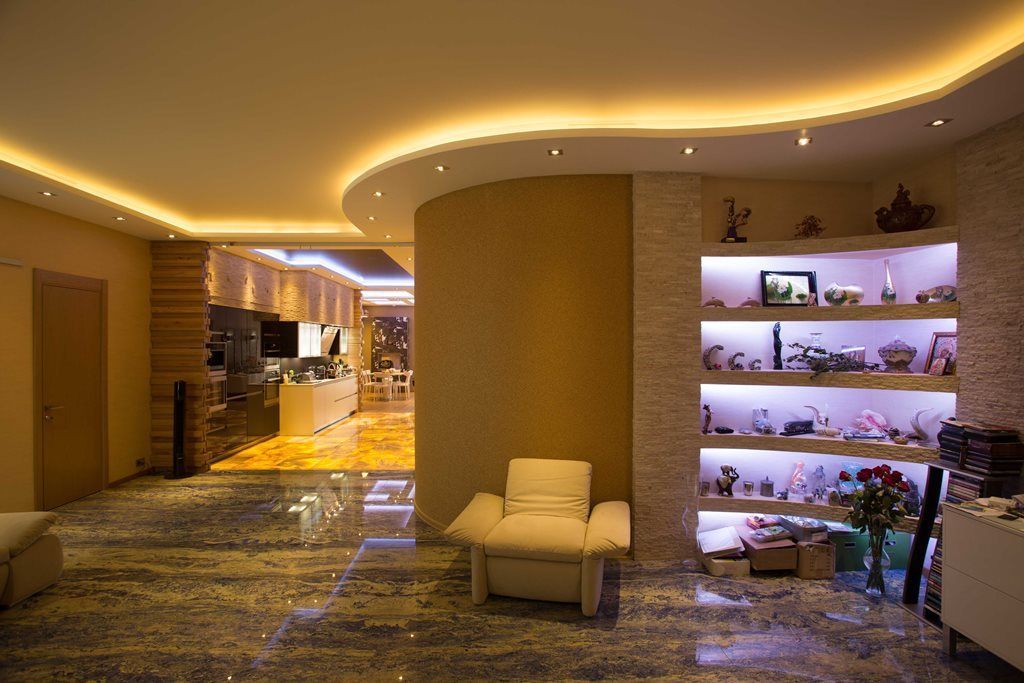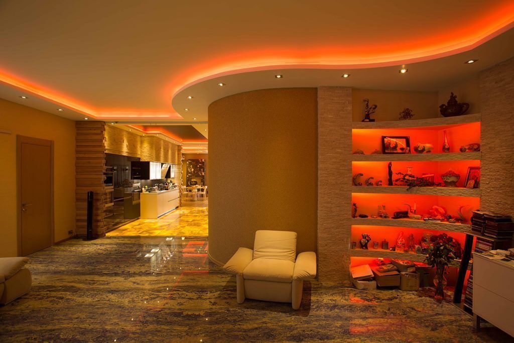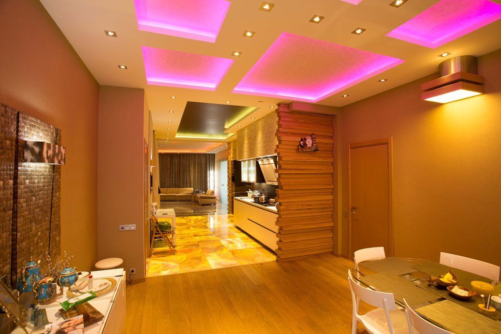Проект квартиры со светодиодной многоцветной подсветкой, установленной на многоуровневых потолках. Основной изюминкой данного интерьера стал пол из оникса со светодиодной подсветкой. Для реализации проекта использовалось светодиодное оборудование торговой марки