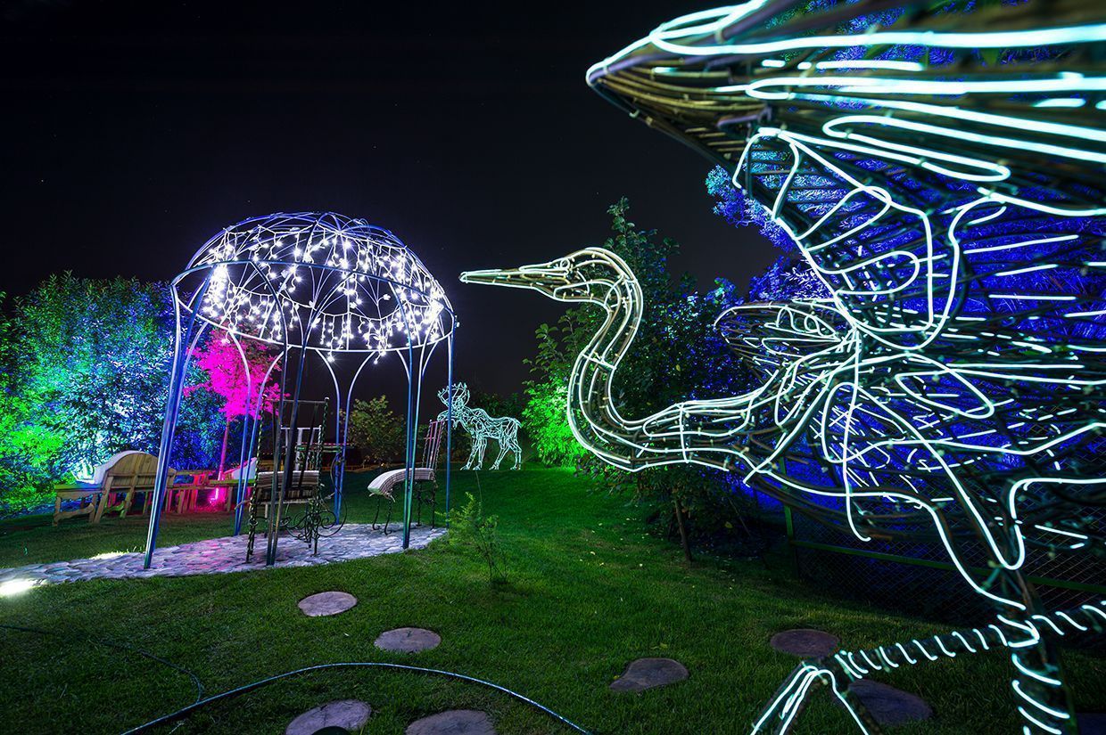 Светодиодная ландшафтная подсветка состоит из подсветки деревьев и освещения дорожек. Для подсветки деревьев используются герметичные светодиодные прожекторы, собранные на основе алюминиевого профиля для светодиодов и светодиодных лент arlight® - SL80 и мощных RGB светодиодов arlight® - ARPL-3W-EPA-RGB с линзами 30°.