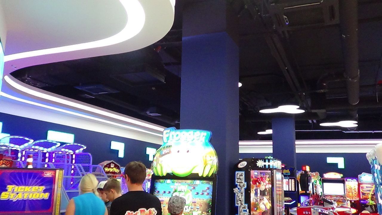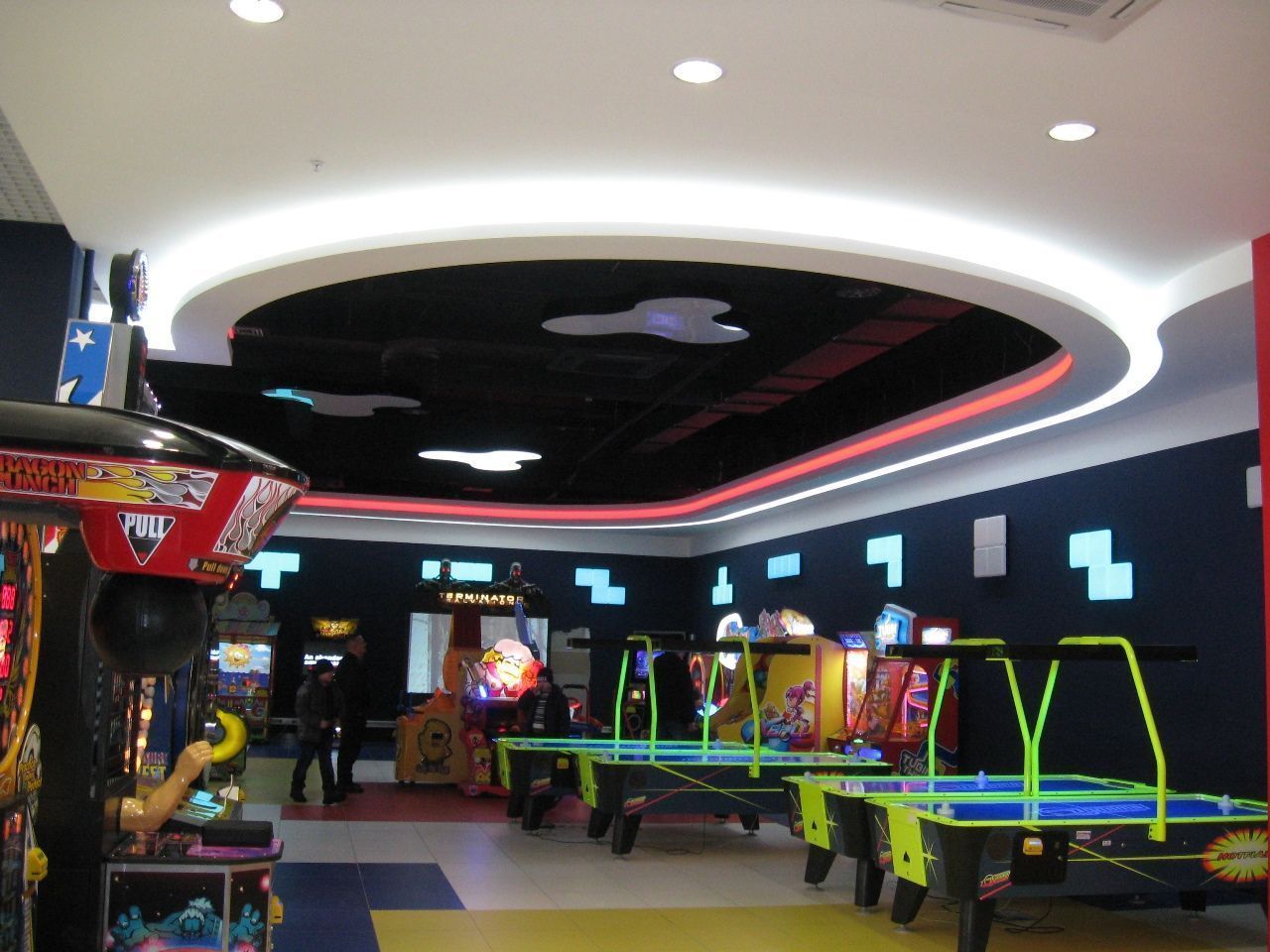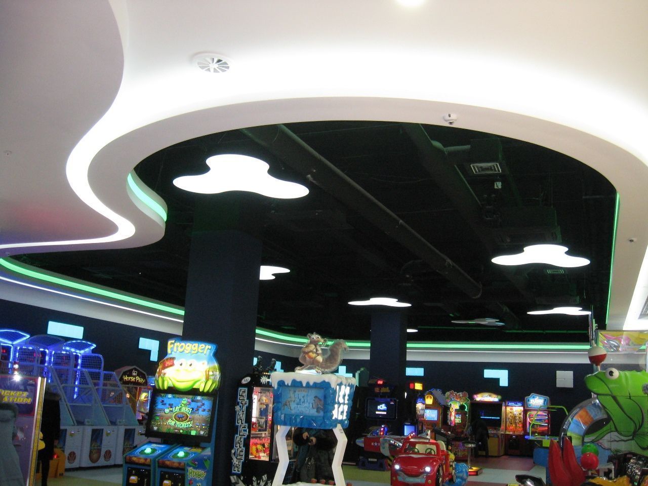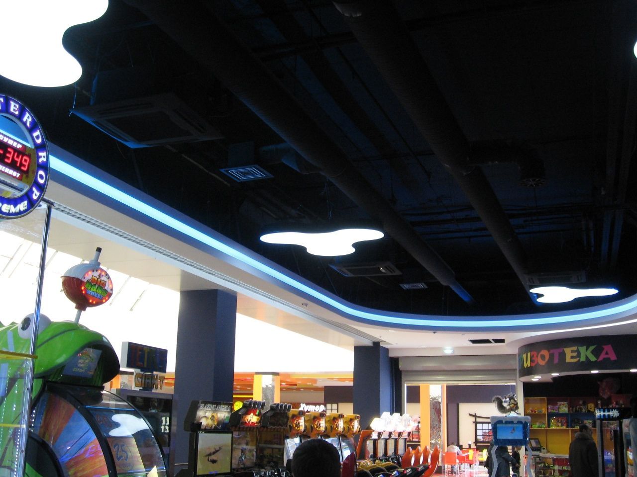 Светодиодная лента также была использована для закарнизной подсветки потолка. Она была установлена в потолочных нишах 1-ого и 2-ого этажа, а также в вышеупомянутом Игропарке. Для подсветки потолка была применена многоцветная RGB светодиодная лента, подключенная к RGB контроллеру, который позволяет легко менять цвет и яркость подсветки с пульта ДУ.