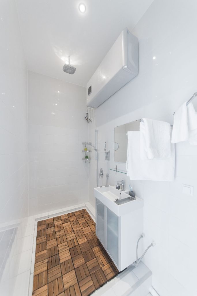 Центральное место в квартире заняла спальная зона, для неё был создан подиум, на котором расположилась кровать. Этот центр был дополнительно выделен при помощи светодиодной подсветки. Боковые стенки и ступени подиума обшиты матовым стеклом, которое рассеивает и смягчает свечение. За стеклом расположен источник света - светодиодная лента Arlight.