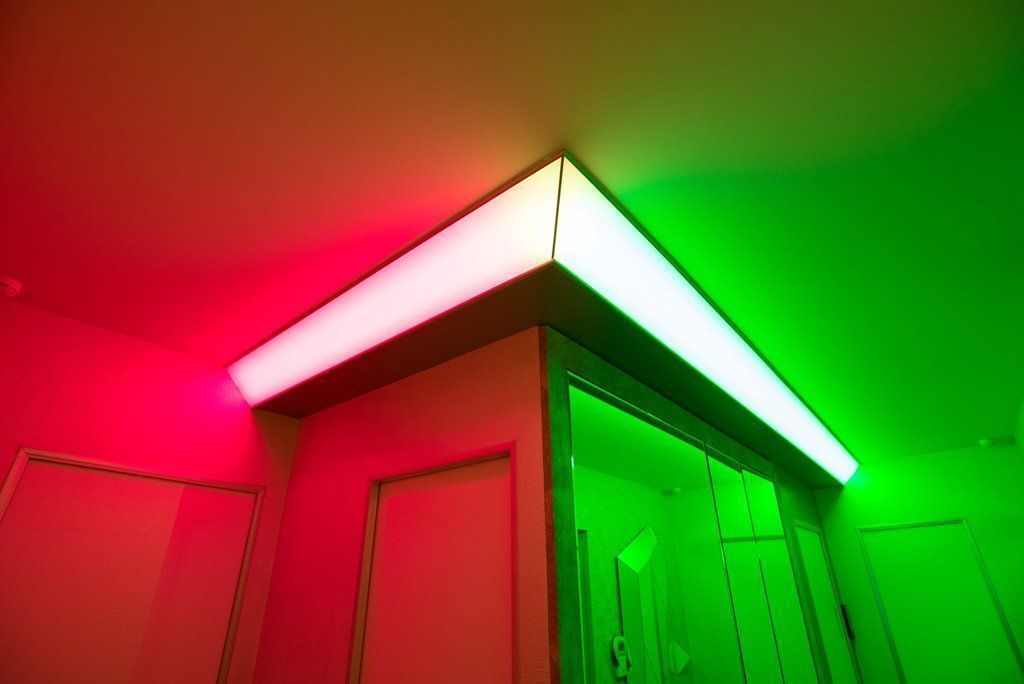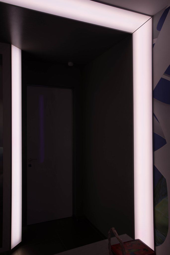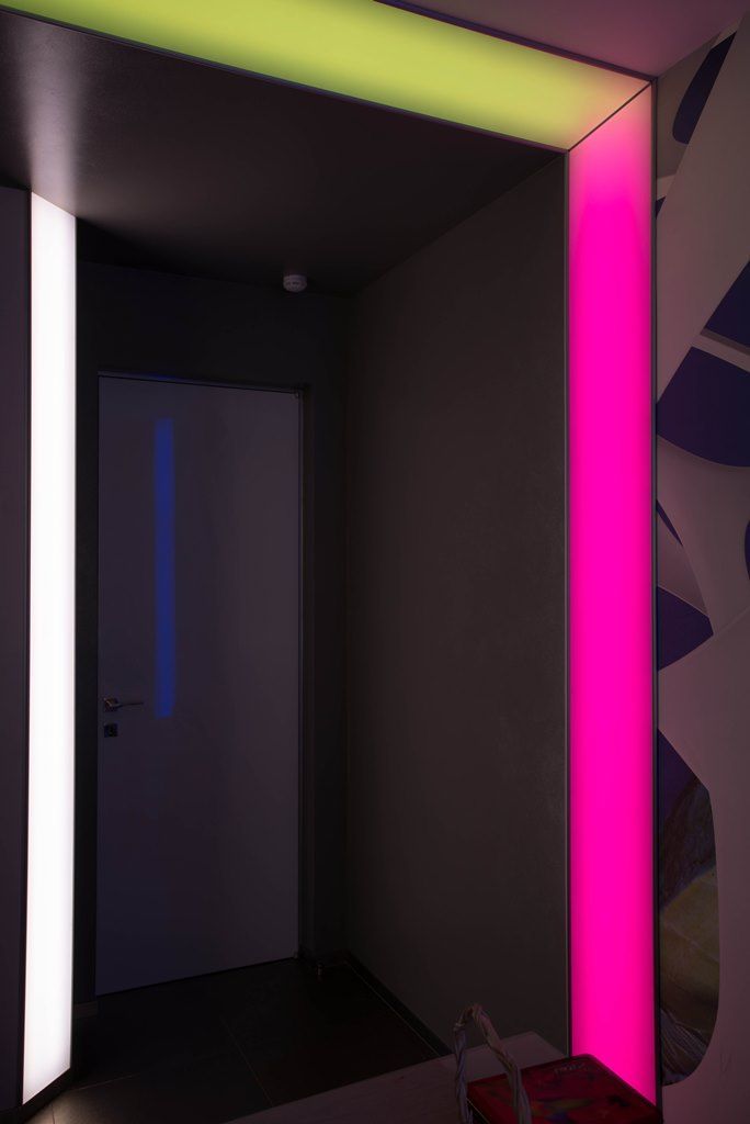 В прихожей освещение также строится на мягкой подсветке скрытой за матовыми пластиковыми панелями. Особенно интересно там смотрится смена цветов RGB-ленты arlight®, многократно отражающаяся в мозаике из зеркал.
