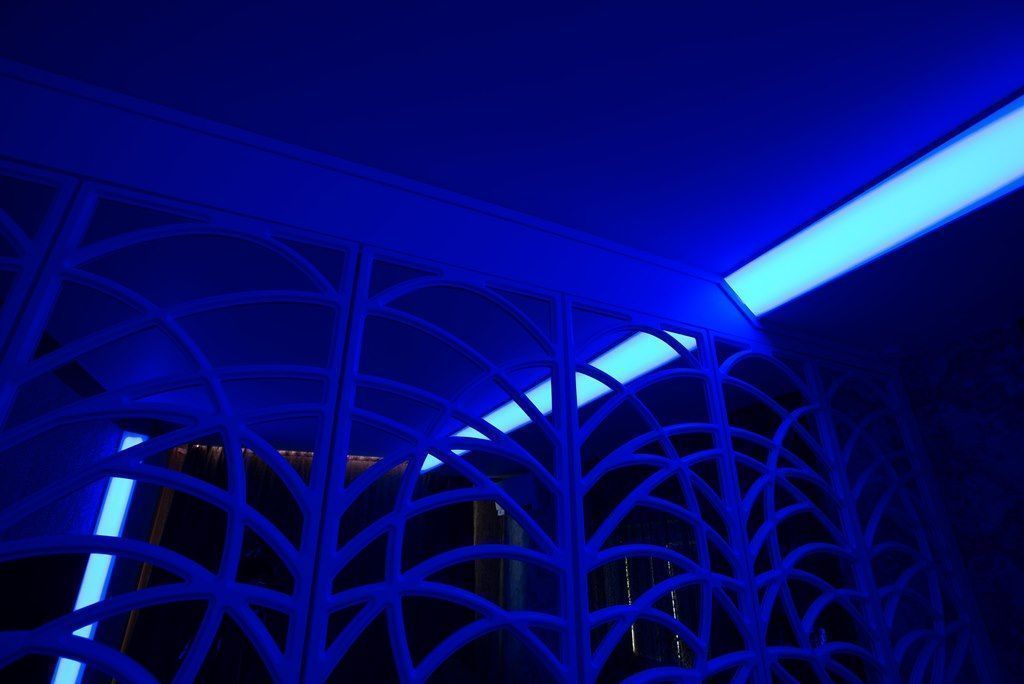 Кроме того вся подсветка в проекте выполнена с помощью многоцветной светодиодной ленты arlight®. Что значительно расширяет декоративные возможности освещения такого рода. Управление освещением происходит с помощью специального пульта с круговой панелью, вращение которой помогает легко и просто выбрать один и тысяч оттенков RGB-ленты.