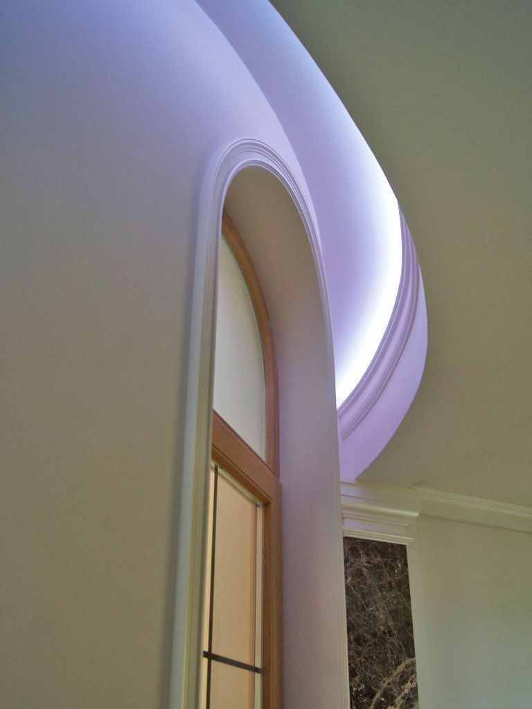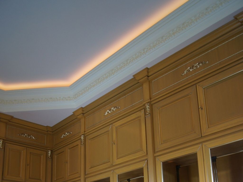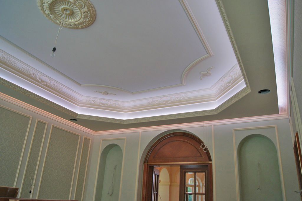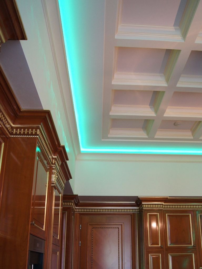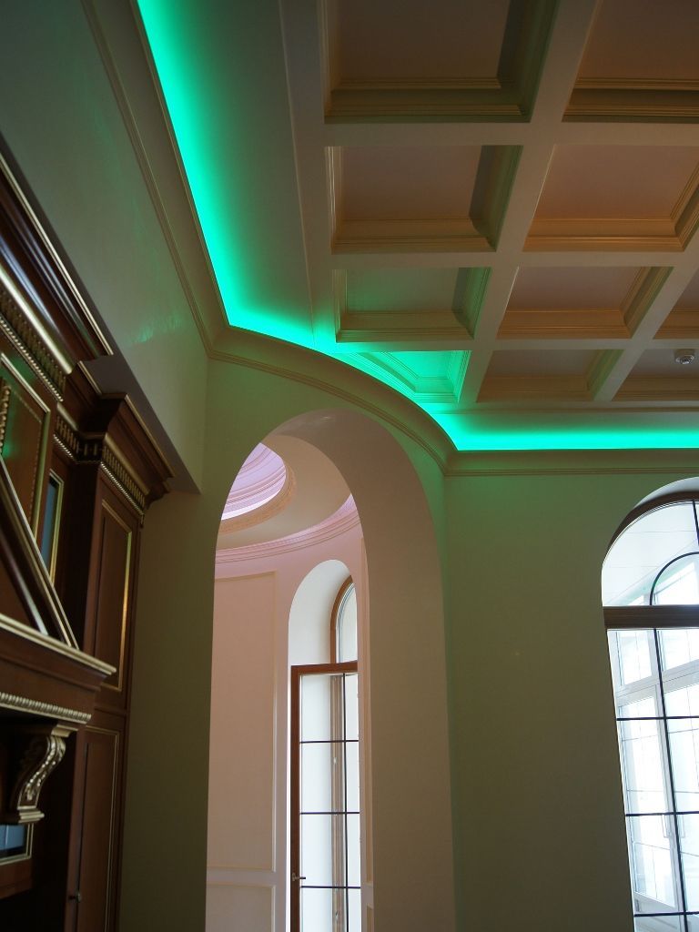 Светодиодное освещение было установлено в загородном доме, интерьер которого выполнен в классическом стиле. Декоративная контурная подсветка, установленная за полиуретановыми карнизами, придала внутренней обстановке дома сказочность и неповторимость.