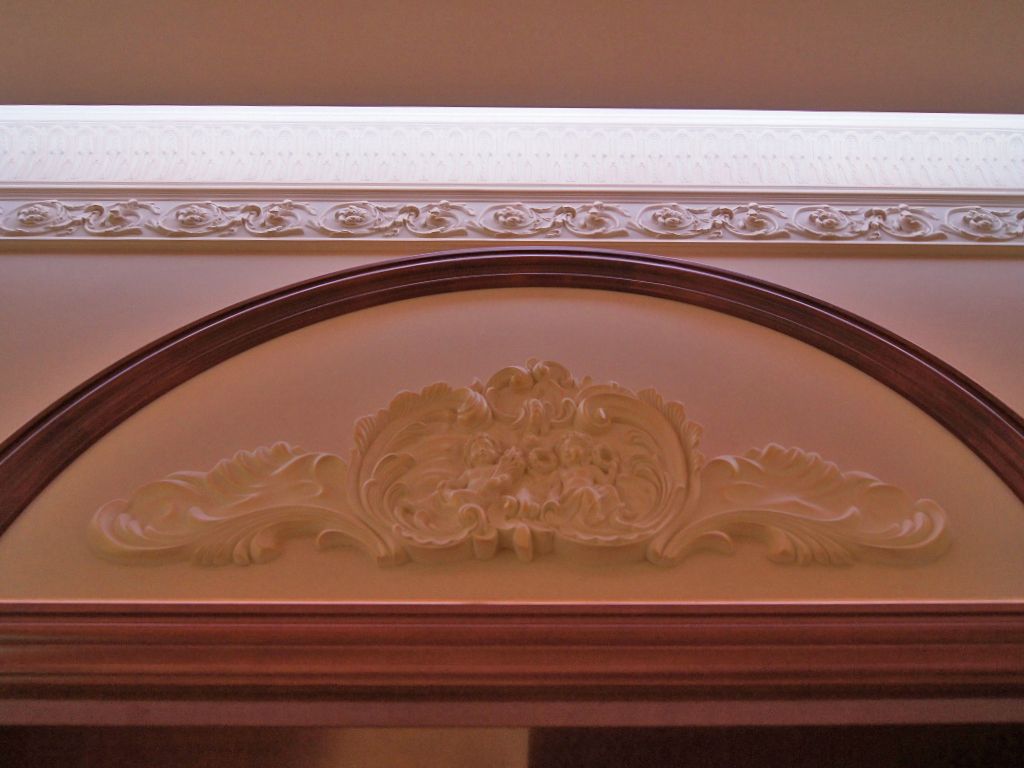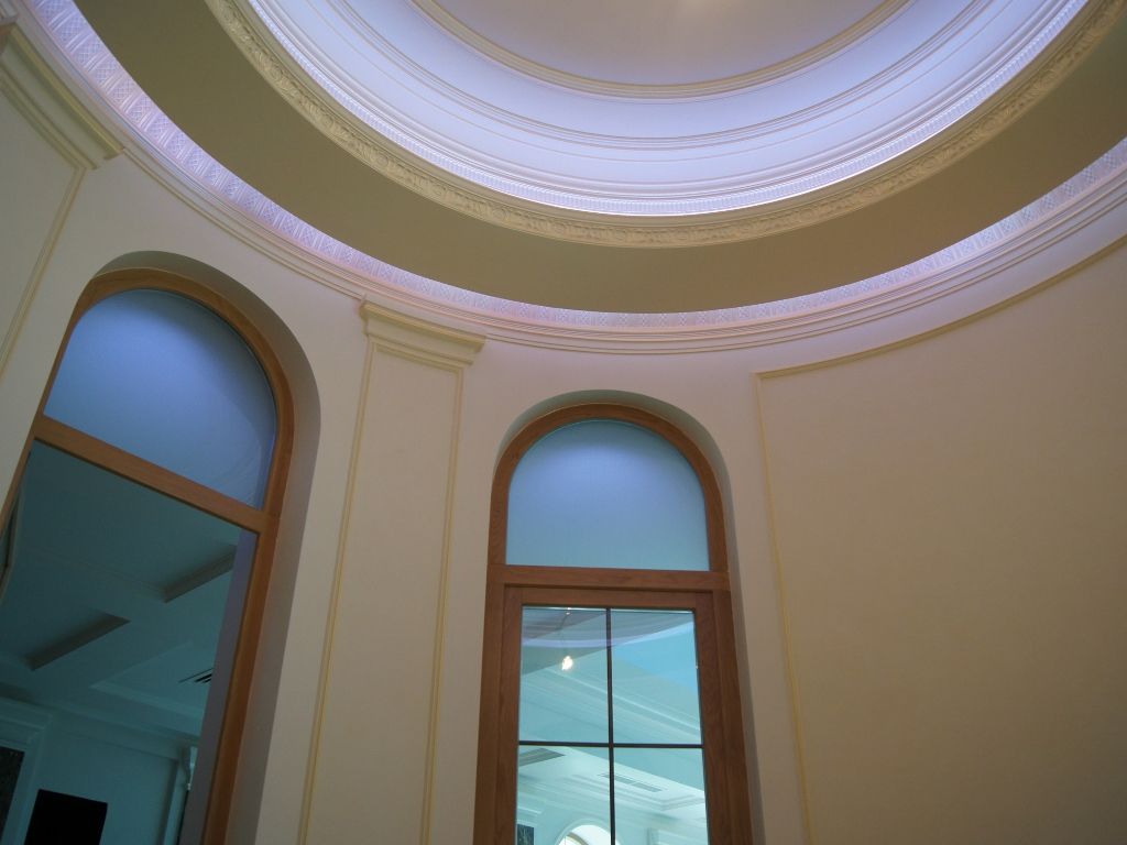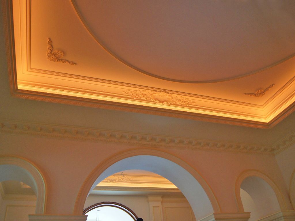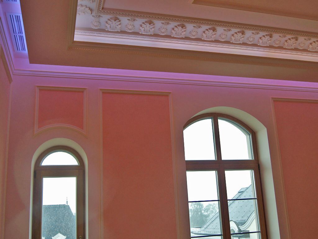 Светодиодное освещение было установлено в загородном доме, интерьер которого выполнен в классическом стиле. Декоративная контурная подсветка, установленная за полиуретановыми карнизами, придала внутренней обстановке дома сказочность и неповторимость.