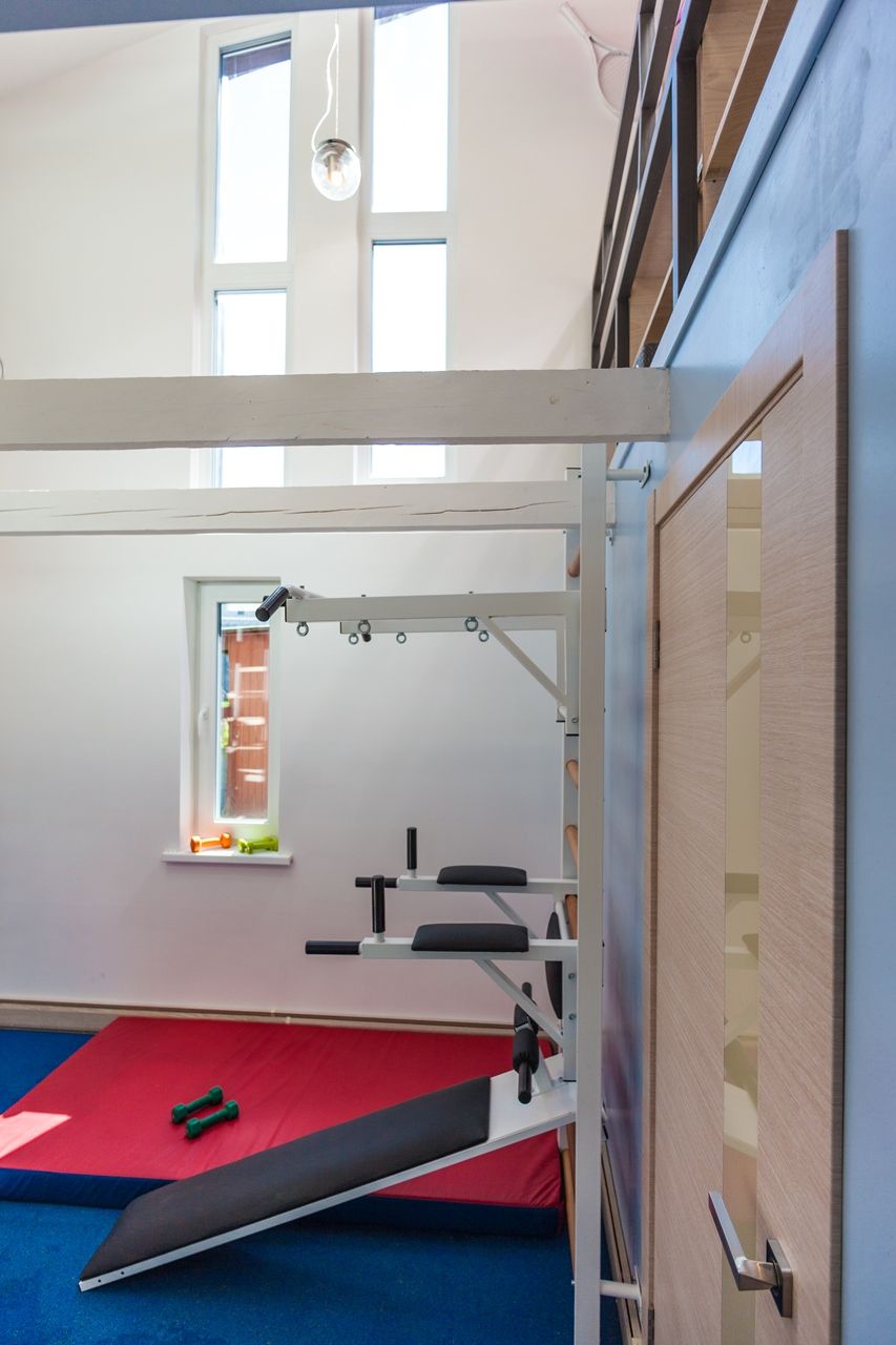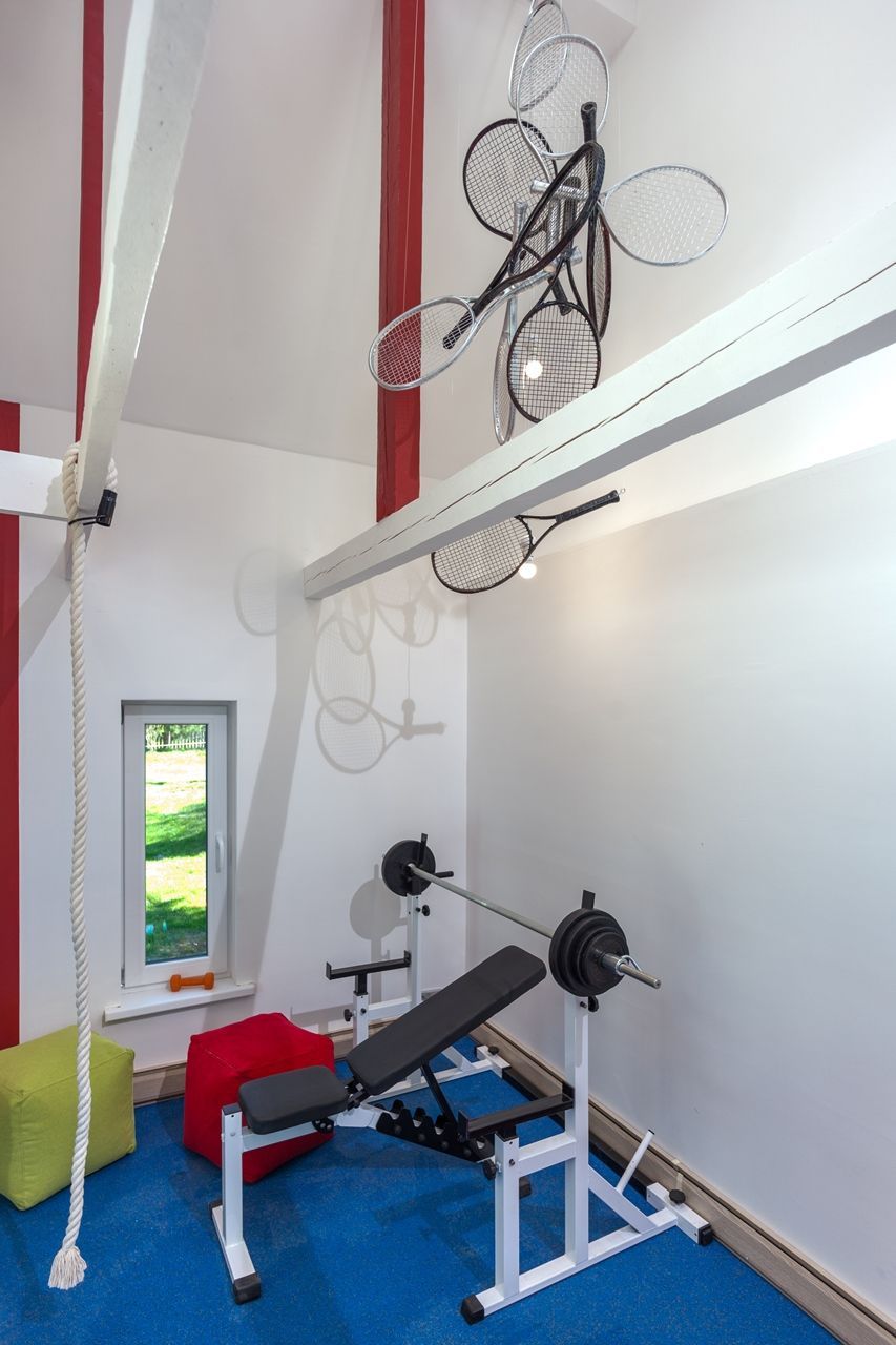 Из двух, расположенных одна над другой, комнат, дизайнеры и мастера телепроекта «Фазенда» на Первом канале сделали просторный спортивный зал. Он получился светлым не только благодаря открывшемуся пространству и большим окнам, но и множеству светодиодных светильников.