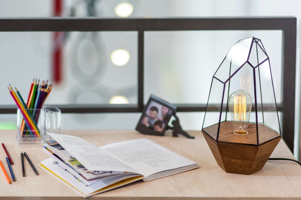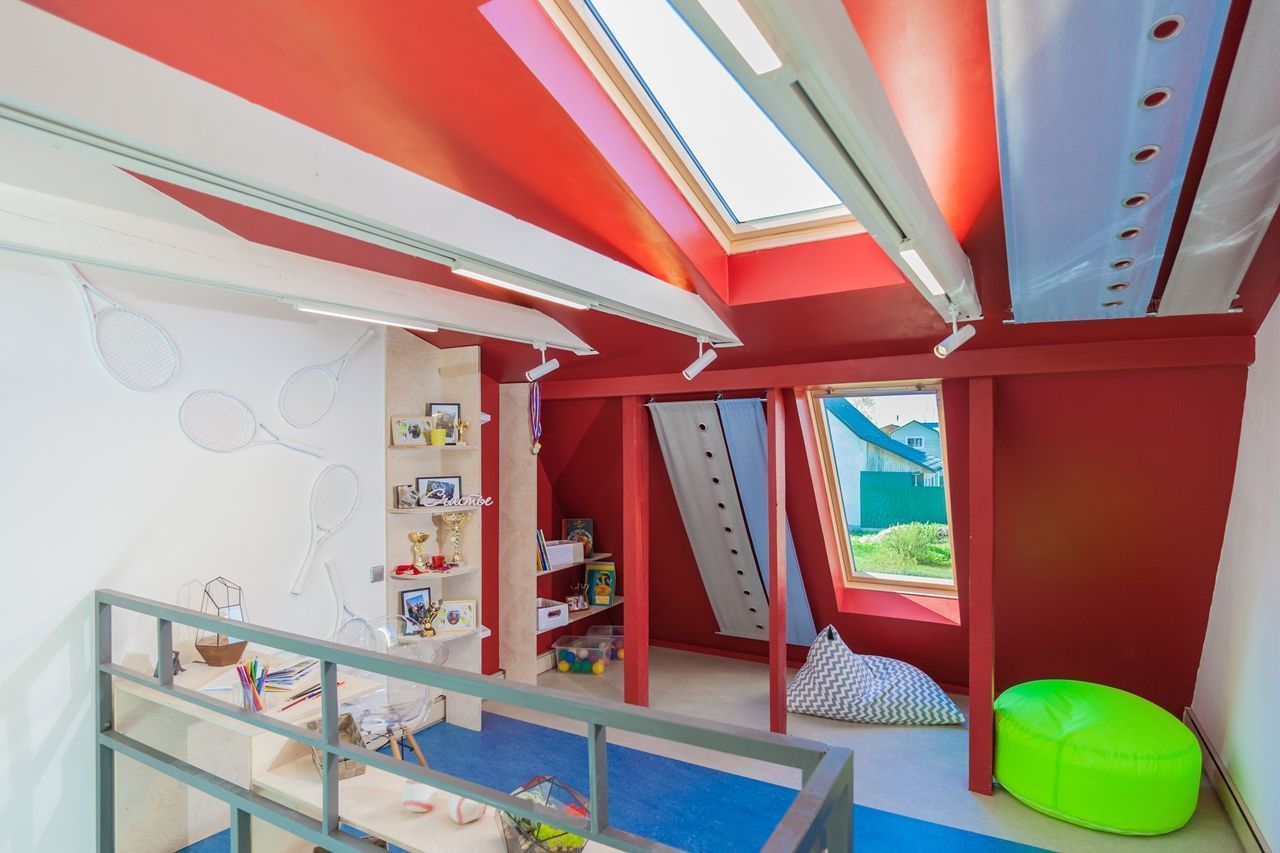 Объектом переделки стали две комнаты в загородном доме, расположенные на двух этажах. Часть перекрытий была убрана, в крыше появилось множество больших окон. Объединённое помещение стало просторным, воздушным и светлым. Светлым и днём, и в тёмное время суток благодаря светодиодным светильникам разных типов.