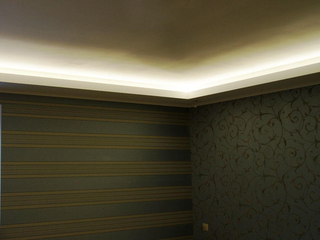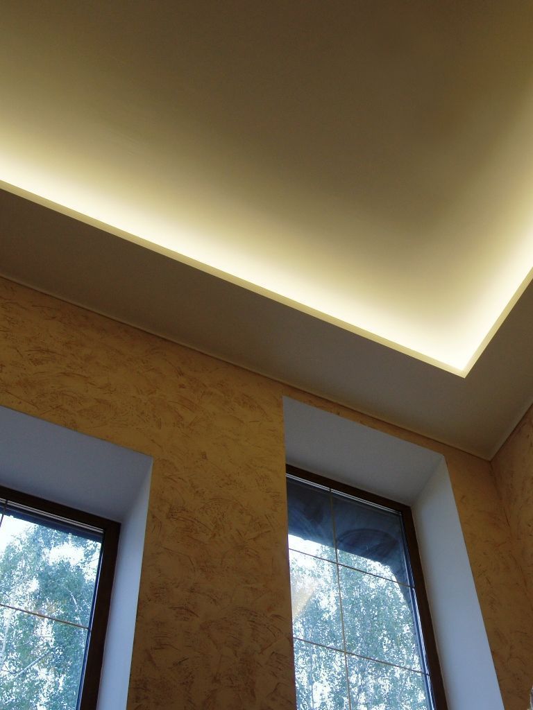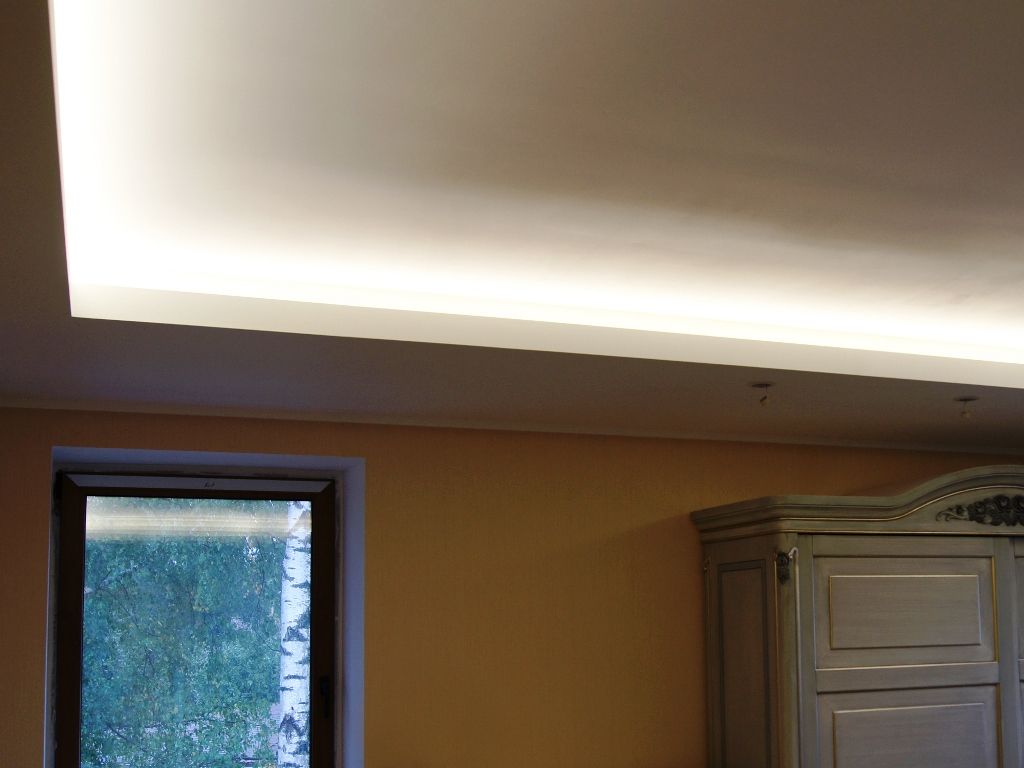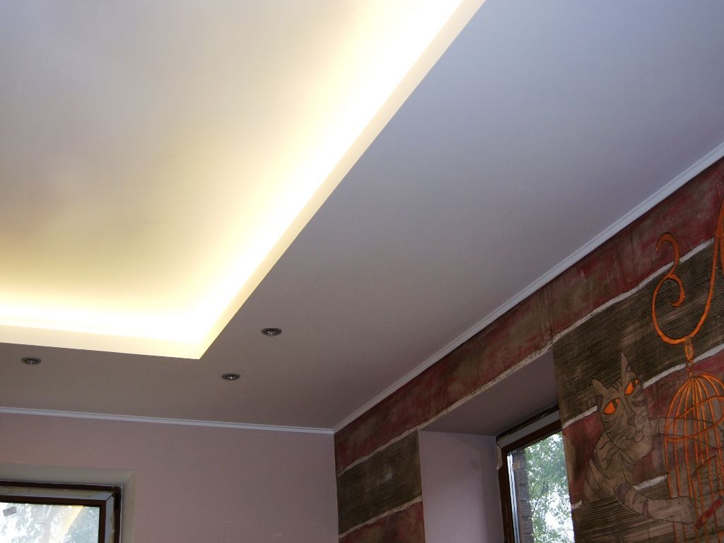 Скрытая светодиодная подсветка, установленная за гипсокартонным потолком, дает мягкий равномерный рассеянный свет. Применение диммеров