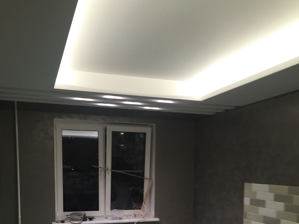 Во всех частях квартиры были сделаны многоуровневые потолки из гипсокартона и все они были дополнены светодиодной подсветкой.