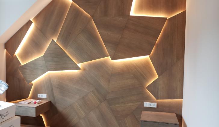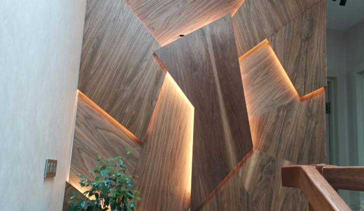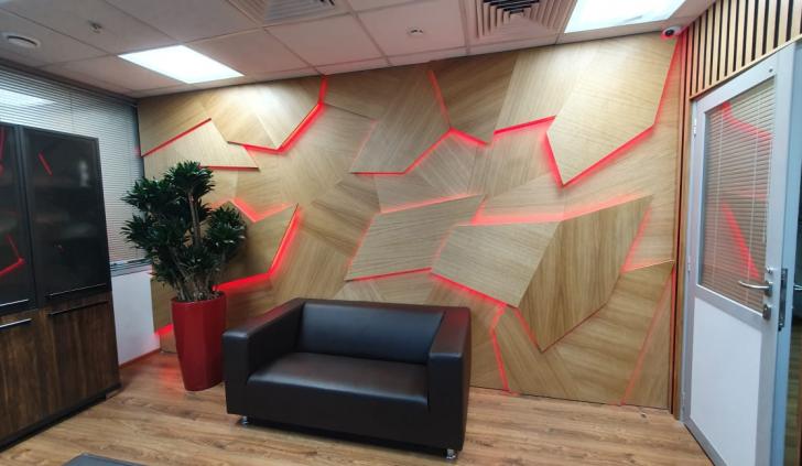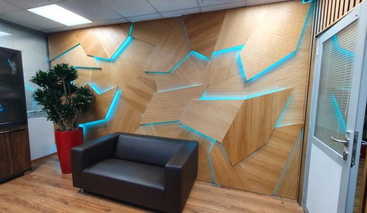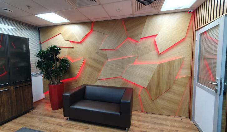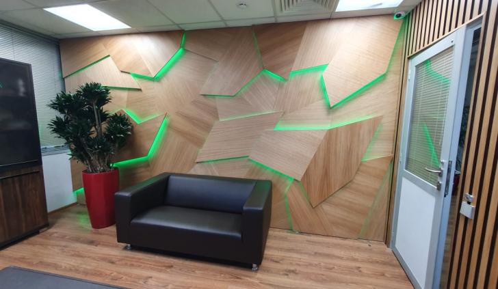 В дизайне входной группы использованы эффектные и объемные 3D-панели с декоративной светодиодной подсветкой, которая сделала композицию еще более оригинальной. Для подсветки панелей используется светодиодная лента с высоким индексом цветопередачи (CRI>98) и теплым белым свечением. Теплый цвет прекрасно гармонирует с деревянной текстурой панелей. В зоне ожидания подсветка реализована RGB-лентами, цвет свечения которых можно менять, экспериментируя и создавая особую атмосферу, актуальную для творческой студии.