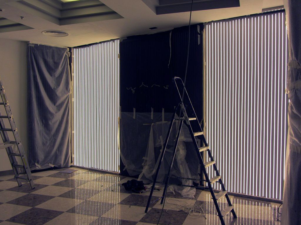 На предварительно подготовленные поверхности с равными промежутками были наклеены светодиодные ленты. Расстояние между ними было рассчитано таким образом, чтобы добиться максимально равномерной засветки витражей.