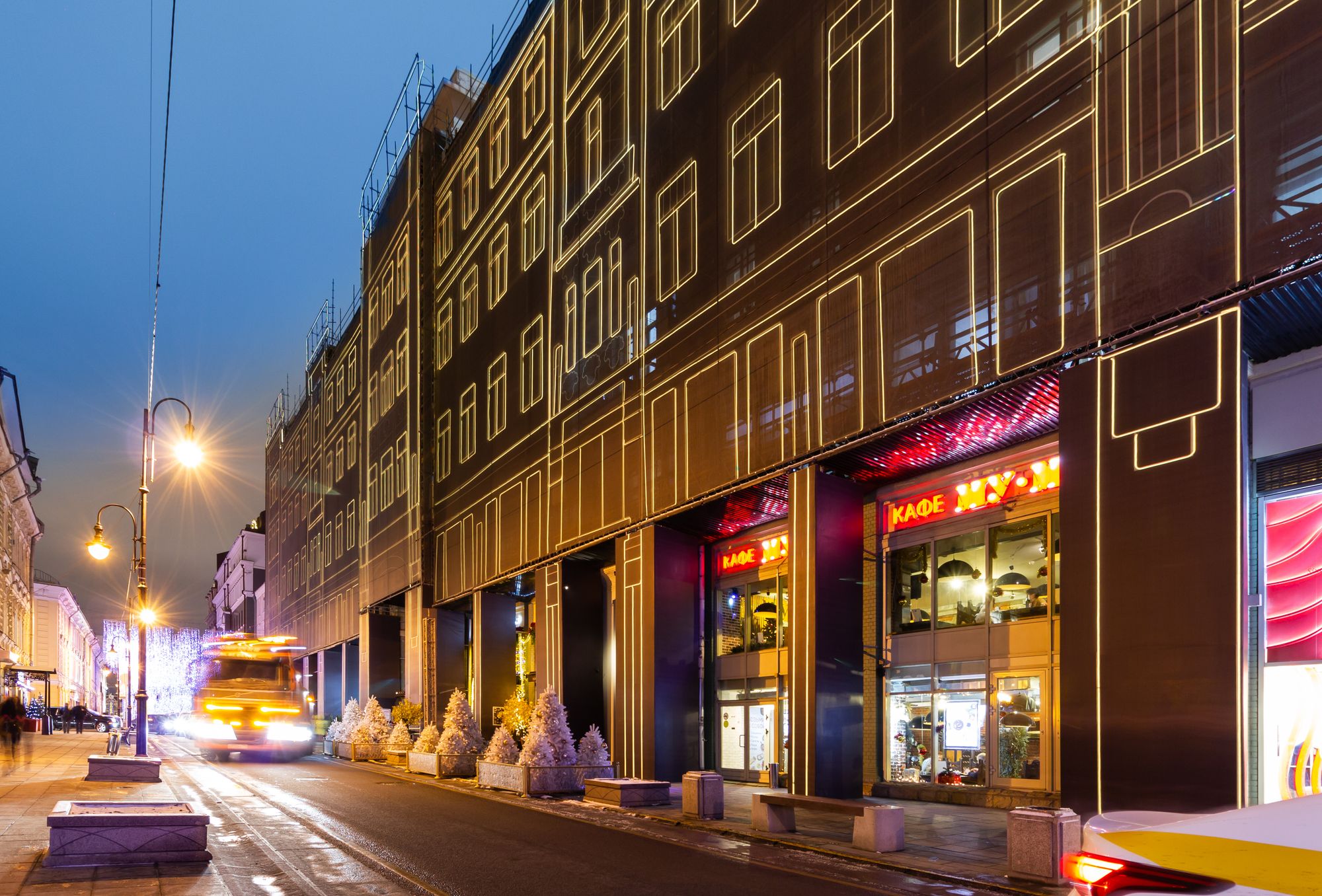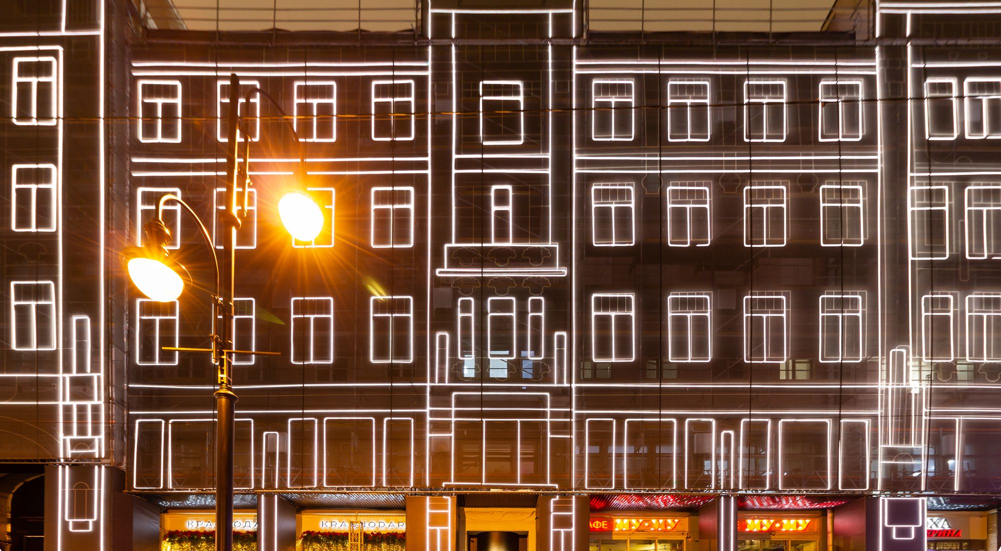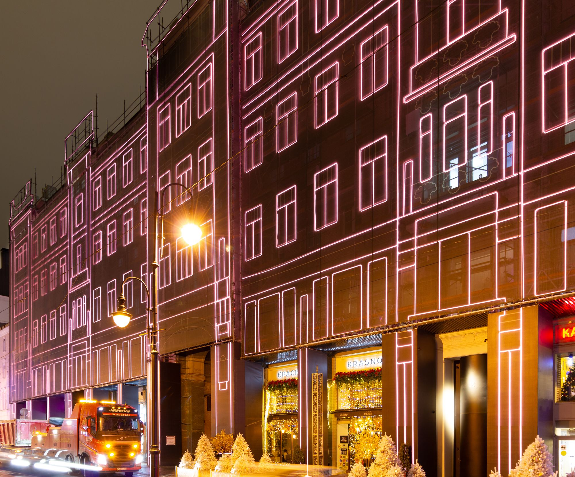 При создании эффектной фасадной подсветки премиального жилого комплекса «Большая Дмитровка IX» было использовано интересное техническое решение. Гибкий неон закреплен на внешней стороне строительной сетки, что позволило проводить отделочные работы и в то же время сделать законченную декоративную подсветку. Возможность изменения цвета RGB-неона с помощью контроллера дает возможность менять световой облик здания. За счет высокой степени пылевлагозащиты IP65 гибкий неон можно эксплуатировать при любых погодных условиях."